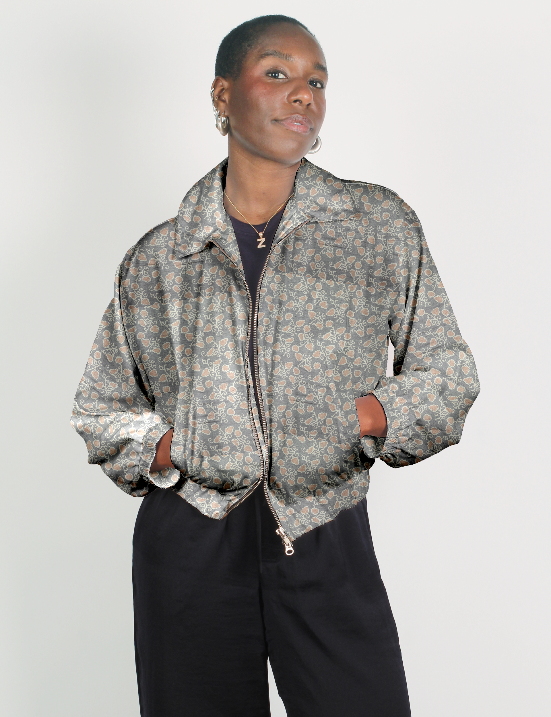 Unsere Bomberjacke ist ein unverzichtbares Must-have für Ihre Garderobe! Dieser Militärklassiker hat eine verkürzte Passform mit elastischem Saum, Bündchen und Bündchen. Sie verfügt über zwei Leistentaschen und zwei Metallreißverschlüsse auf der Vorderseite. Das Futter ist mit kontrastierendem Sari-Print und einem umklappbaren Kragen versehen. Die perfekte Schicht für Frühlingstage, kühle Abende oder klimatisierte Arbeitsplätze, ohne zu beschweren.
