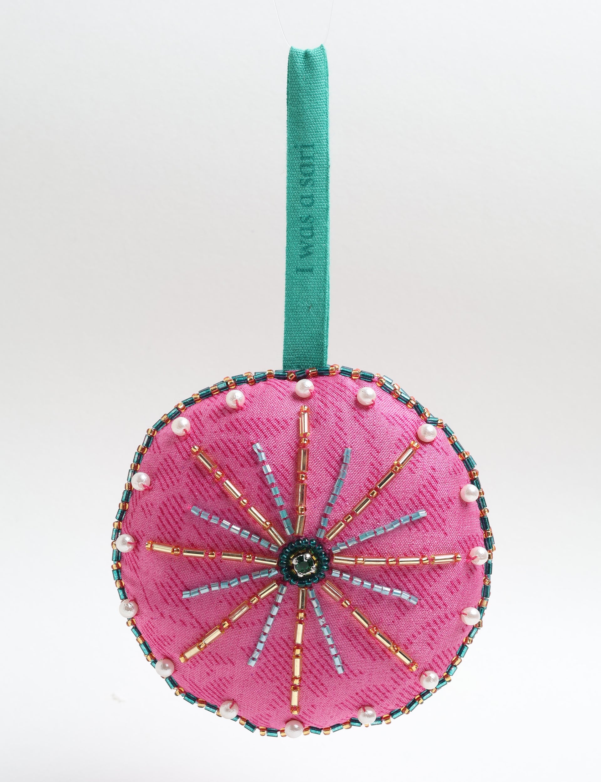 Die festliche Dekoration in Form eines Vollmonds besteht aus einer Auswahl farbenfroher Saris und ist mit Stoffresten gefüllt. Sie ist mit aufwendiger Aari-Stickerei und gespendeten Perlen und Steinen handbestickt.