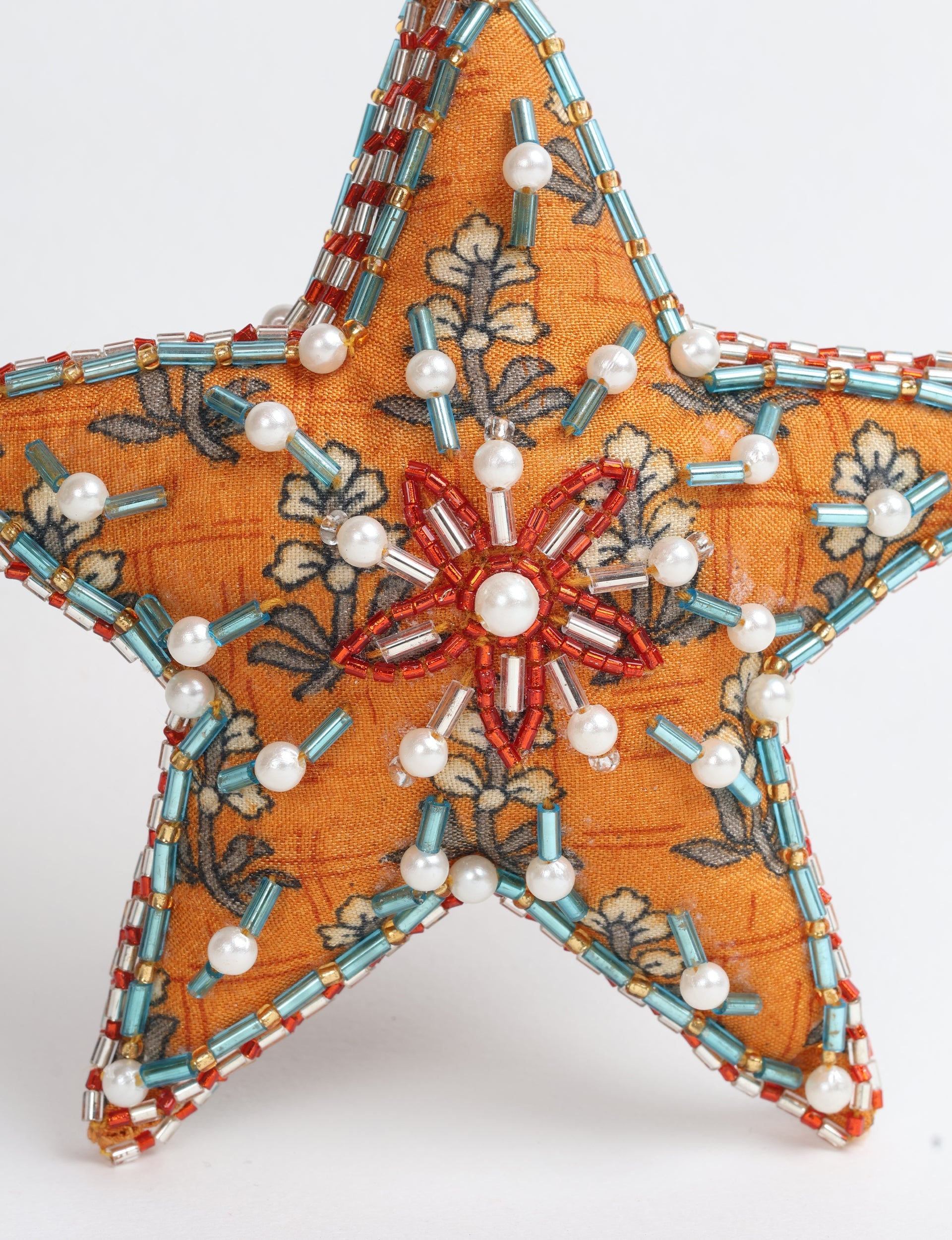 Die sternförmige Festdekoration besteht aus einer Auswahl farbenfroher Saris und ist mit Stoffresten gefüllt. Sie ist mit aufwendiger Aari-Stickerei und gespendeten Perlen und Steinen handbestickt.