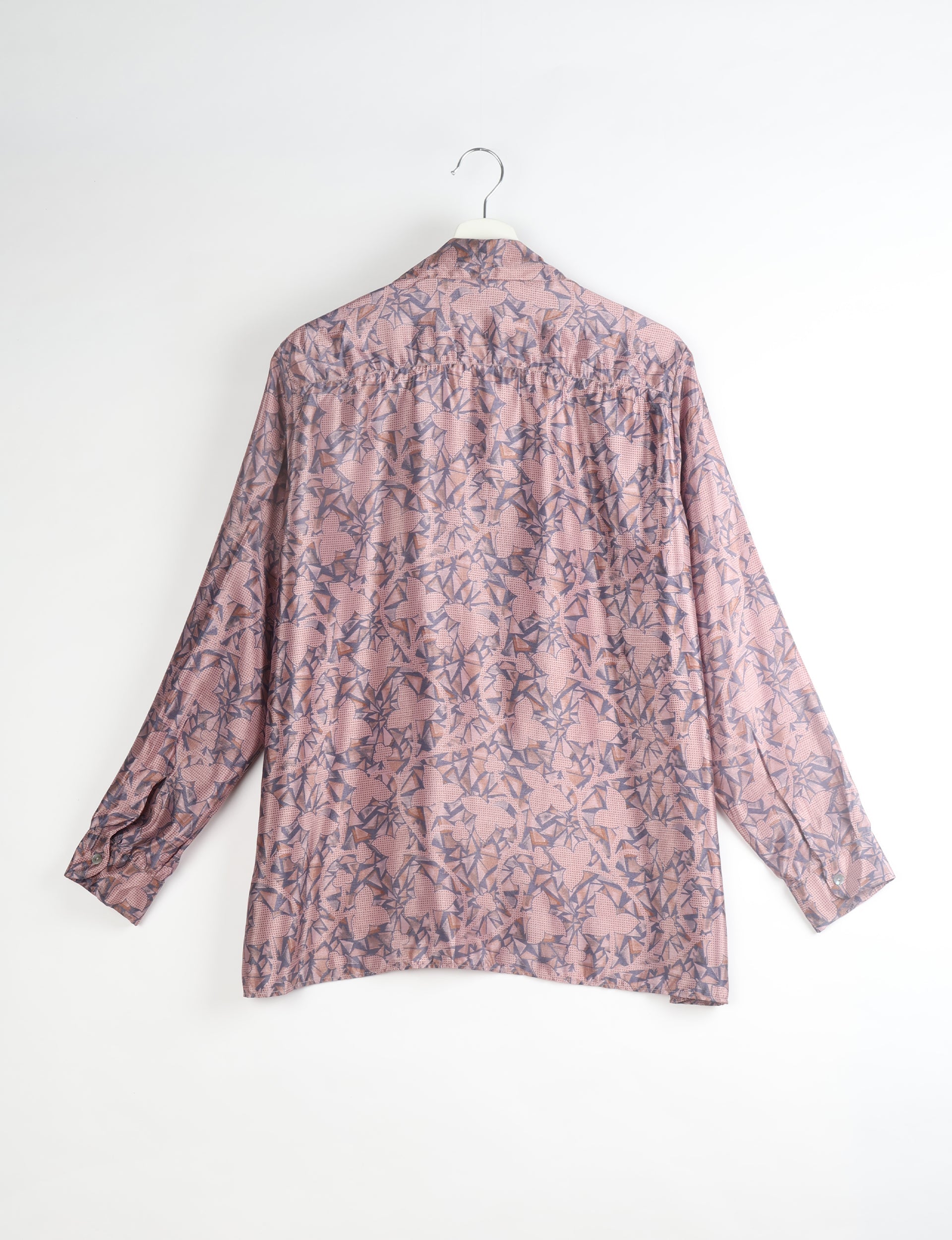 Dies ist ein langärmeliges Button-Down-Hemd mit lockerer Passform und einem Reverskragen. Die Ärmel sind lang und mit einfachen Umschlagmanschetten versehen.