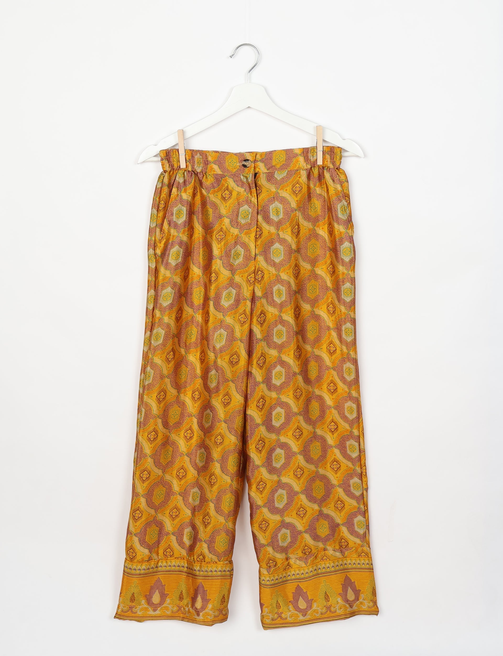 Ich wurde auf dem Markt in Mumbai gesammelt und nicht neu hergestellt, daher ist meine genaue Stoffzusammensetzung unbekannt. Pflegen Sie mich nachhaltig mit Handwäsche, Trocknen auf der Leine und Bügeln bei niedriger Temperatur. Ich kann auch in der Maschine gewaschen und chemisch gereinigt werden, sofern ich keine Stickereien oder Verzierungen habe, die beschädigt werden könnten.
