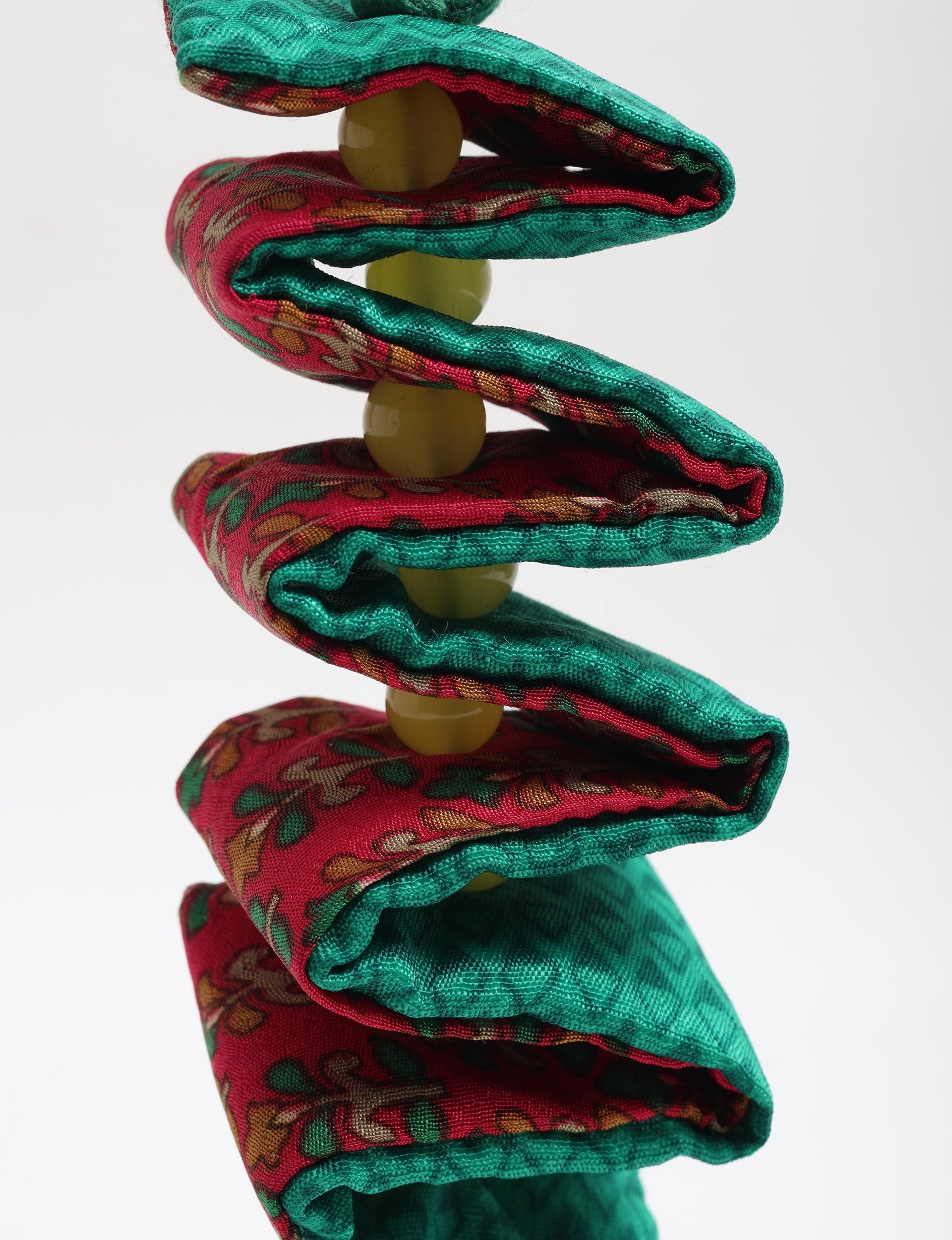 This is a special addition ornament. Made from pre-loved saris and filled with organic cotton filling, it’s adorned with pearls and metallic beads that reflect celestial beauty. Each handcrafted ornaments brings an elegant sparkle to your decorations. Lighting and screens may cause slight variations in color appearance.