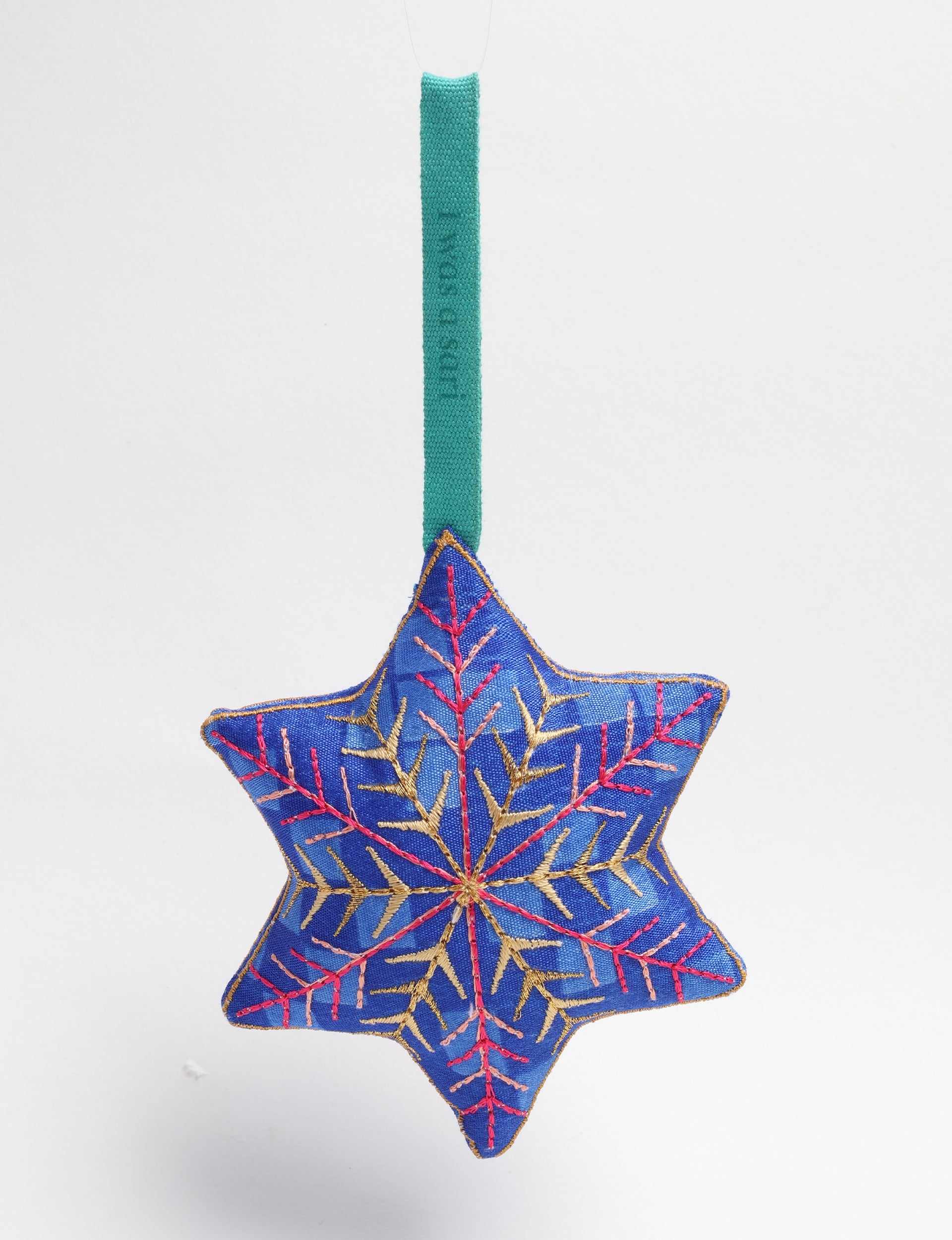 Die schneeflockenförmige Dekoration ist aus gebrauchten Saris gefertigt und mit Bio-Baumwolle gefüllt. Mit leuchtender Seide und metallischem Goldfaden bestickt und von Hand fertiggestellt.