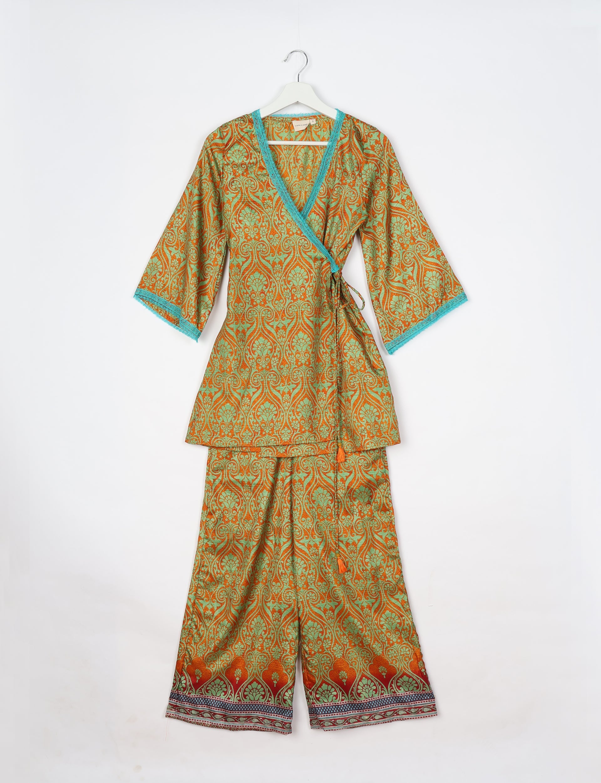 Zweiteiliges Set mit einem V-Ausschnitt-Tuniktop und weit geschnittener Hose. Das Top hat 3/4-lange Ärmel und wird an der Taille mit einem Gürtel geschlossen. Der obere Teil ist mit kontrastierendem Spitzenbesatz entlang der wichtigen Kanten versehen.