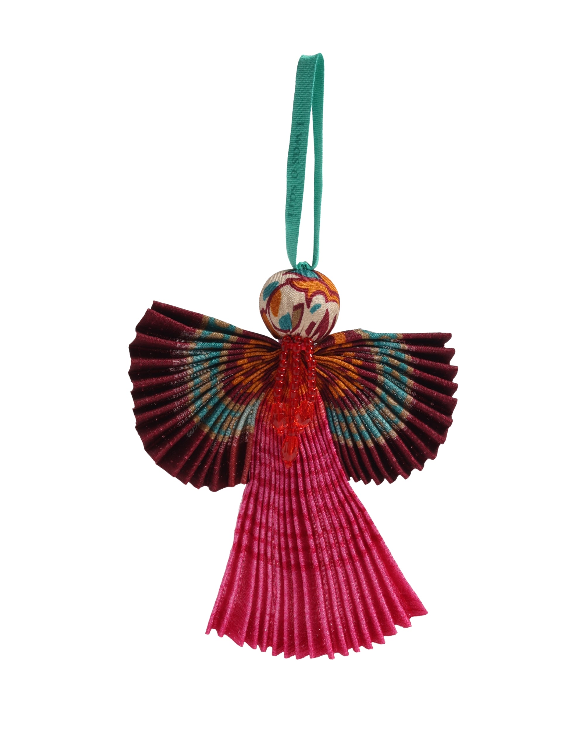 Ein handgefertigtes Hängeornament in Engelsform. Es verfügt über gefaltete Flügel und einen ausgestellten Körper mit Perlenverzierung. Mit einer Schlaufe zum einfachen Aufhängen an einem Weihnachtsbaum oder einer festlichen Dekoration.