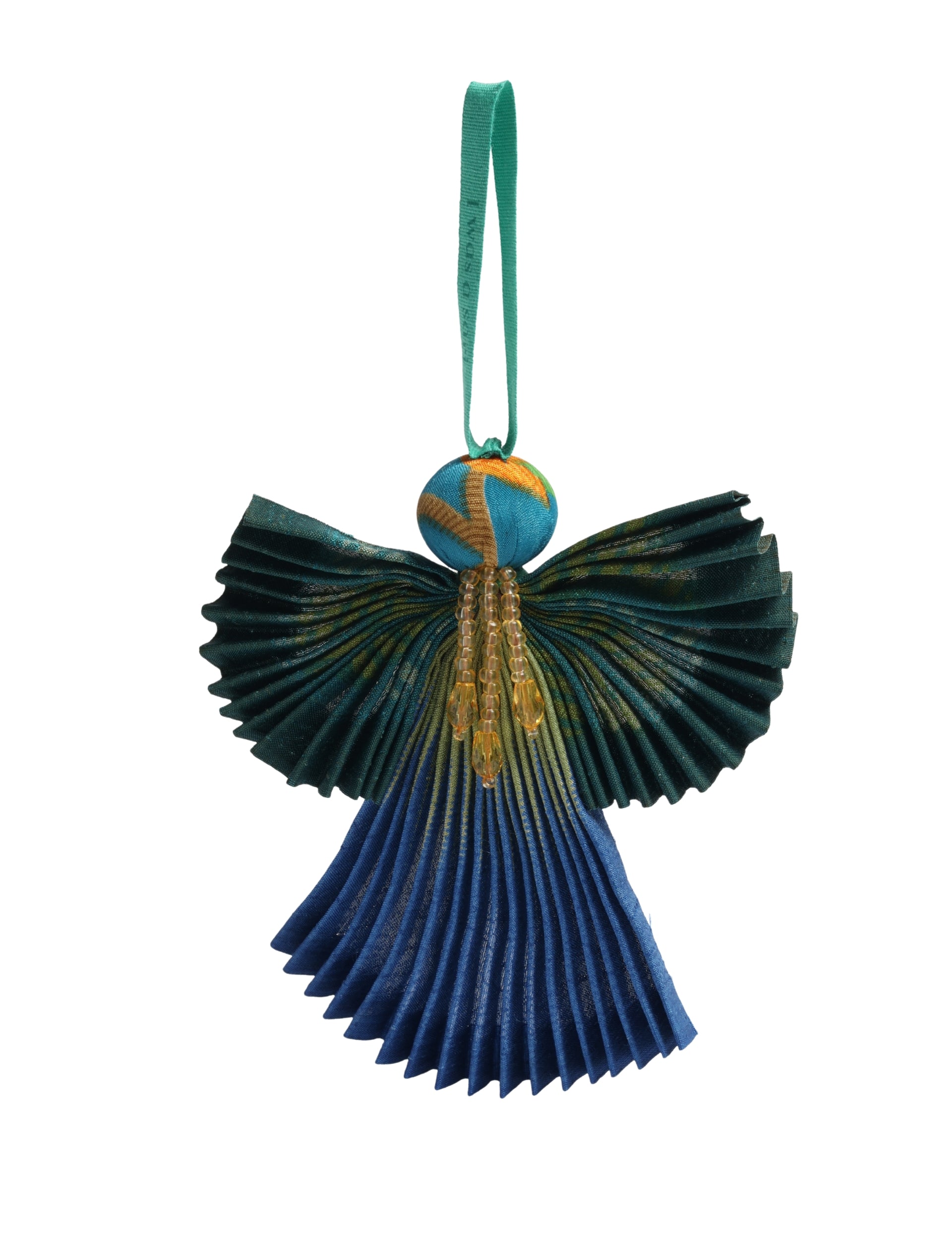 Ein handgefertigtes Hängeornament in Engelsform. Es verfügt über gefaltete Flügel und einen ausgestellten Körper mit Perlenverzierung. Mit einer Schlaufe zum einfachen Aufhängen an einem Weihnachtsbaum oder einer festlichen Dekoration.