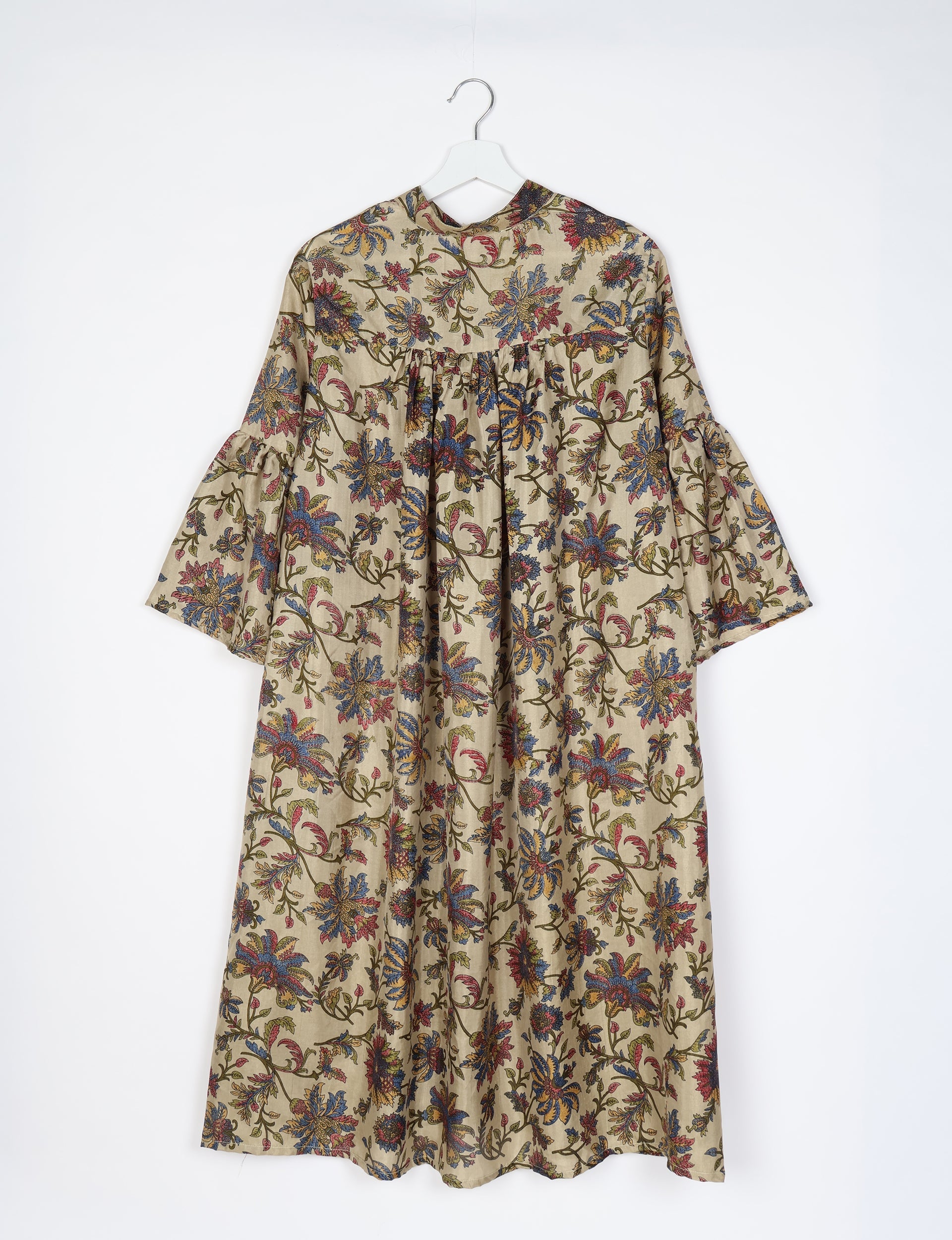 Leichter, langer Mantel mit strukturierten Glockenärmeln. Mit Rundhalsausschnitt mit Stehkragen, Knopfverschluss vorne bis zur Mitte des Oberschenkels und geradem Saum. Die Ärmel sind an den Bündchen gerafft und die Rückseite ist unterhalb der Passe für mehr Weite gerafft.
