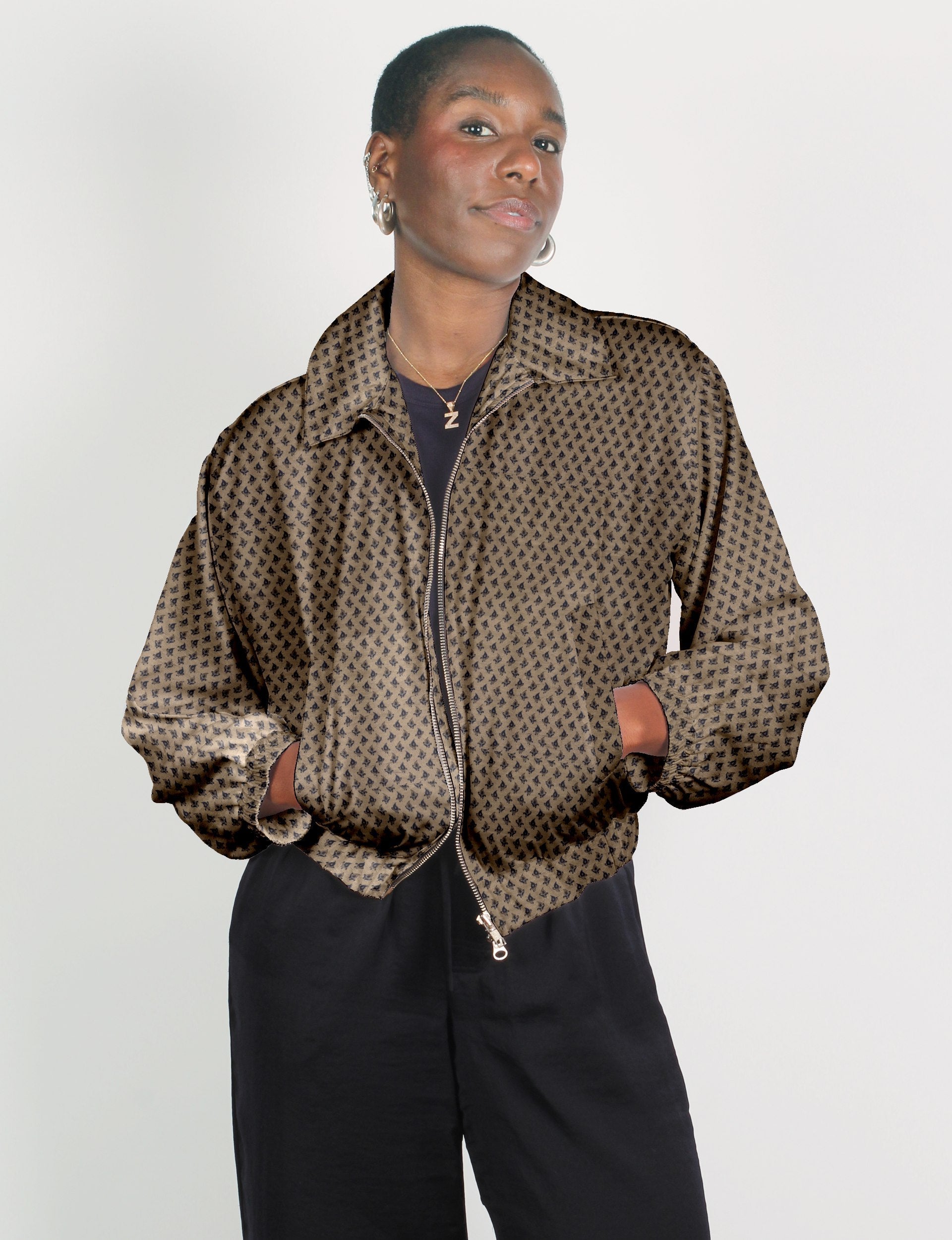 Unsere Bomberjacke ist ein unverzichtbares Must-have für Ihre Garderobe! Dieser Militärklassiker hat eine verkürzte Passform mit elastischem Saum, Bündchen und Bündchen. Sie verfügt über zwei Leistentaschen und zwei Metallreißverschlüsse auf der Vorderseite. Das Futter ist mit kontrastierendem Sari-Print und einem umklappbaren Kragen versehen. Die perfekte Schicht für Frühlingstage, kühle Abende oder klimatisierte Arbeitsplätze, ohne zu beschweren.