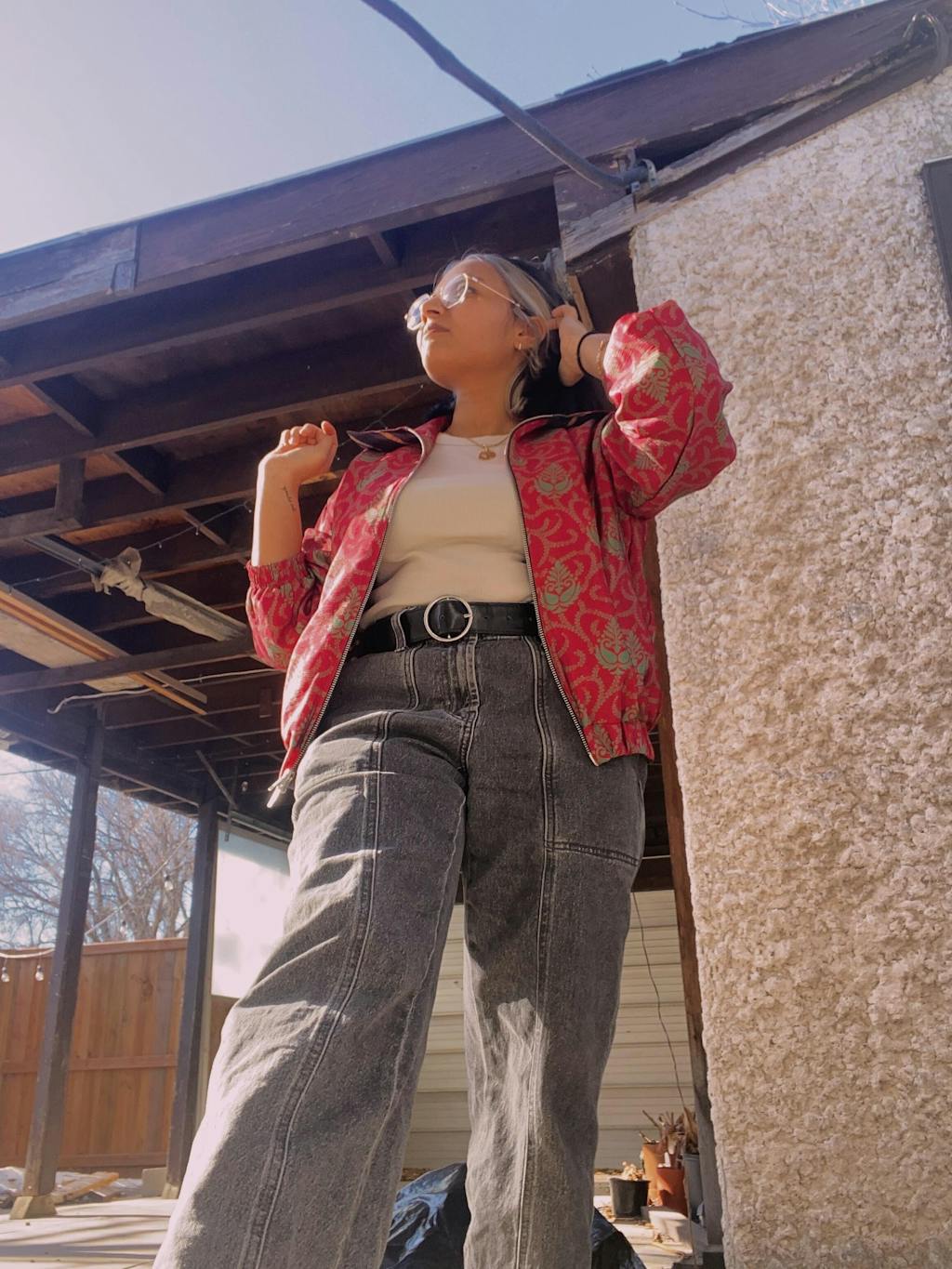 Unsere Bomberjacke ist ein unverzichtbares Must-have für Ihre Garderobe! Dieser Militärklassiker hat eine verkürzte Passform mit elastischem Saum, Bündchen und Bündchen. Sie verfügt über zwei Leistentaschen und zwei Metallreißverschlüsse auf der Vorderseite. Das Futter ist mit kontrastierendem Sari-Print und einem umklappbaren Kragen versehen. Die perfekte Schicht für Frühlingstage, kühle Abende oder klimatisierte Arbeitsplätze, ohne zu beschweren.