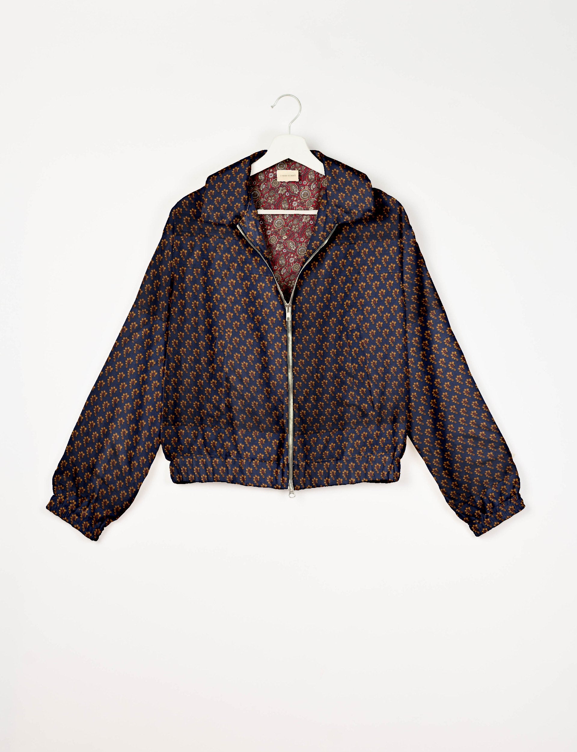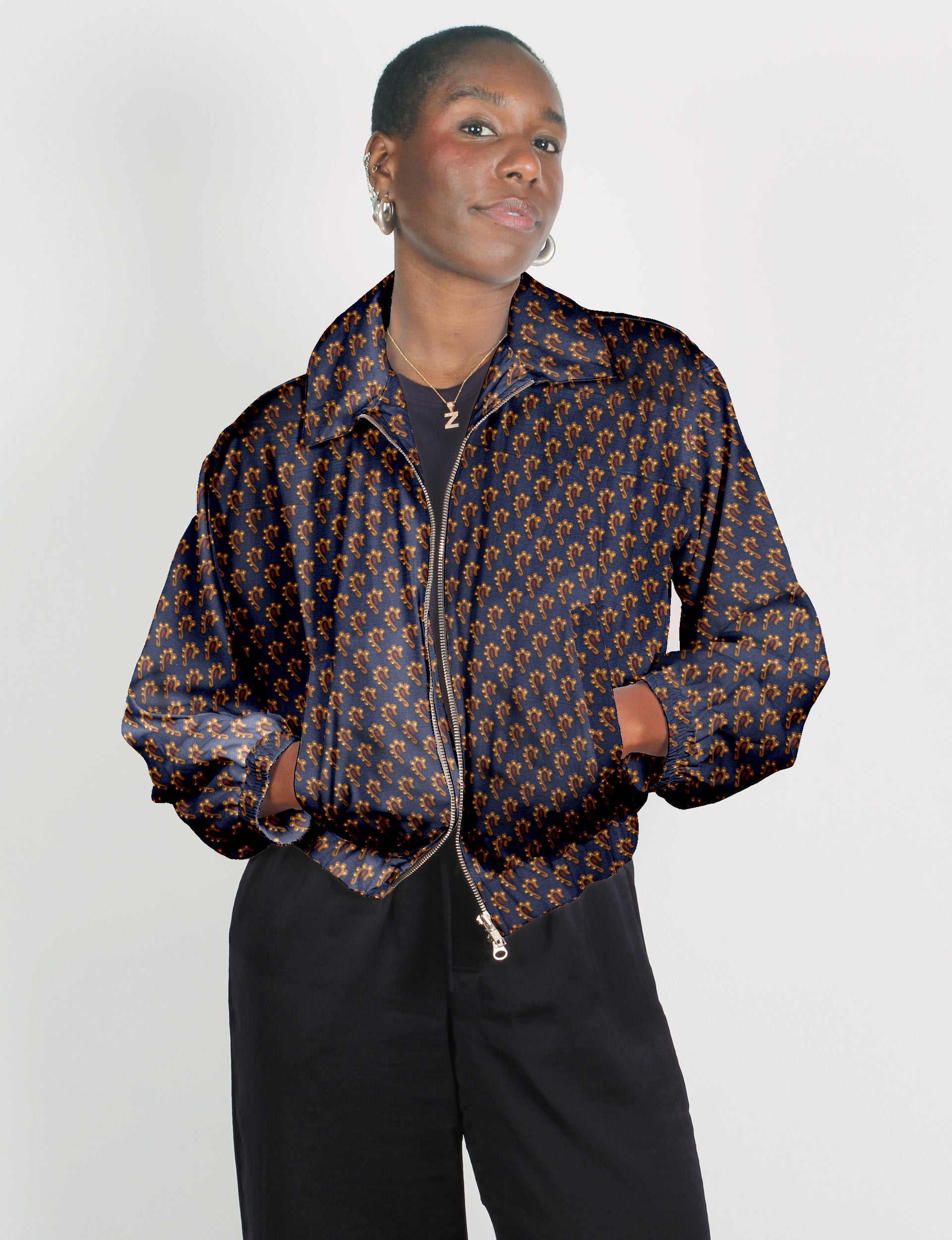 Unsere Bomberjacke ist ein unverzichtbares Must-have für Ihre Garderobe! Dieser Militärklassiker hat eine verkürzte Passform mit elastischem Saum, Bündchen und Bündchen. Sie verfügt über zwei Leistentaschen und zwei Metallreißverschlüsse auf der Vorderseite. Das Futter ist mit kontrastierendem Sari-Print und einem umklappbaren Kragen versehen. Die perfekte Schicht für Frühlingstage, kühle Abende oder klimatisierte Arbeitsplätze, ohne zu beschweren.