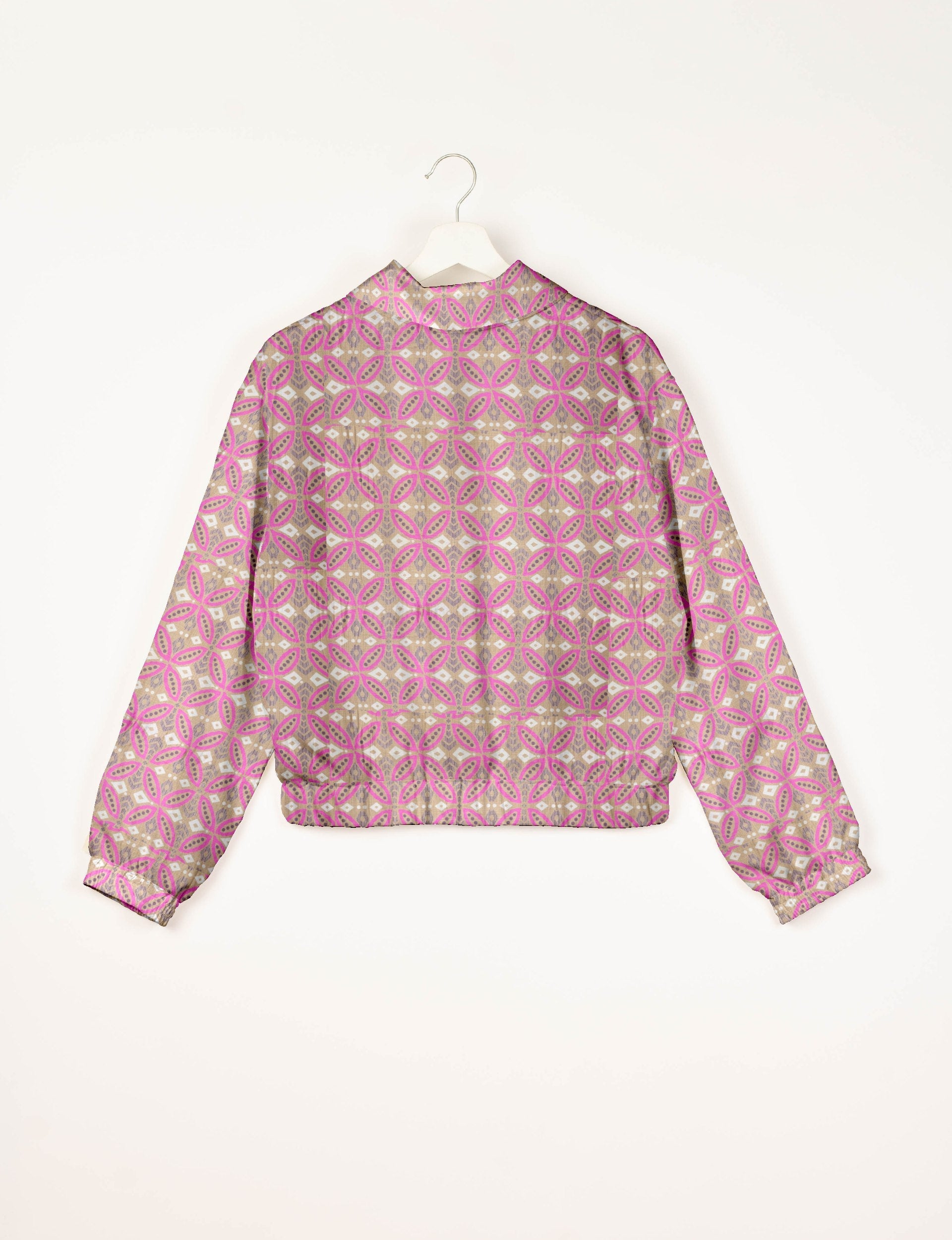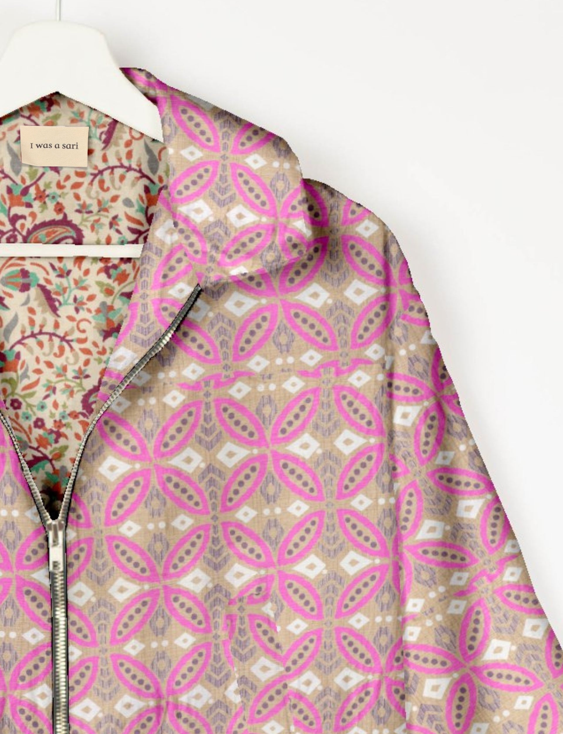 Unsere Bomberjacke ist ein unverzichtbares Must-have für Ihre Garderobe! Dieser Militärklassiker hat eine verkürzte Passform mit elastischem Saum, Bündchen und Bündchen. Sie verfügt über zwei Leistentaschen und zwei Metallreißverschlüsse auf der Vorderseite. Das Futter ist mit kontrastierendem Sari-Print und einem umklappbaren Kragen versehen. Die perfekte Schicht für Frühlingstage, kühle Abende oder klimatisierte Arbeitsplätze, ohne zu beschweren.