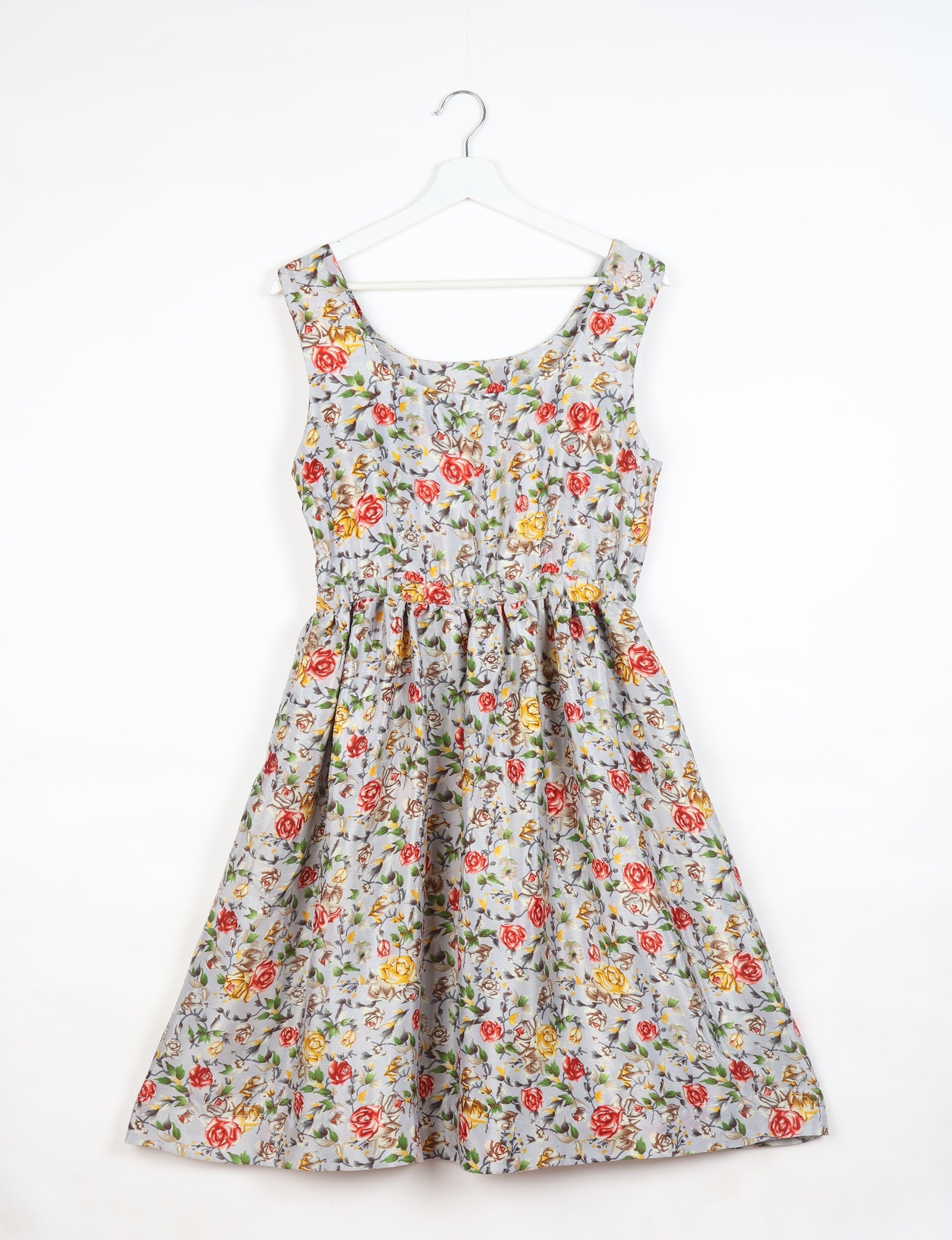 This is a sleeveless fit-and-flare dress featuring a scooped neckline and a defined waist seam. The waistline is cinched with elastic for comfort and flexibility, leading into a gathered flared skirt that finishes at knee length. Lighting and screens may cause slight variations in color appearance.