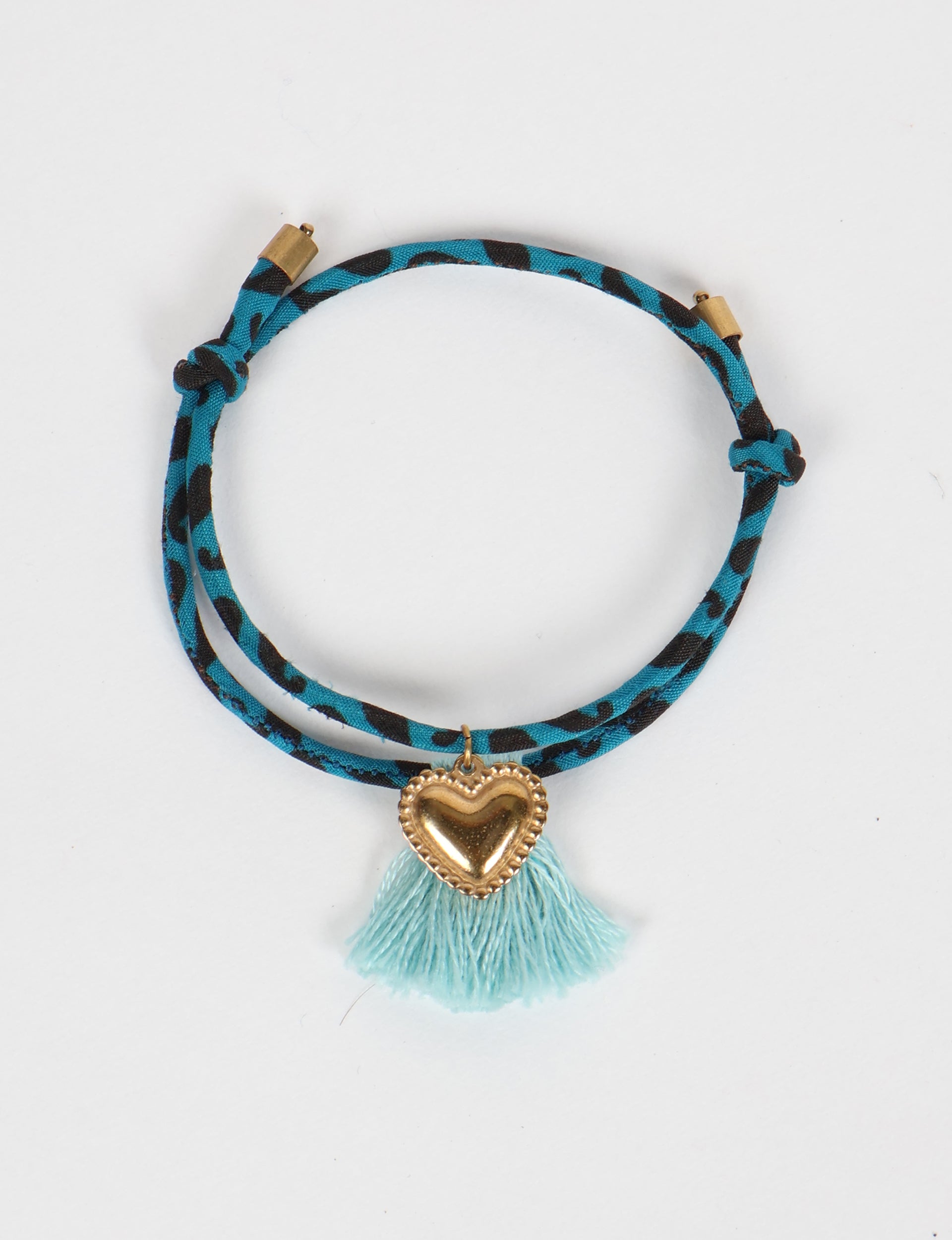Doppelt gewickeltes Seilarmband mit metallischen Endkappen, Quasten und einem zentralen goldfarbenen Herzanhänger. Verstellbare Wickeloptik für flexible Größenanpassung.