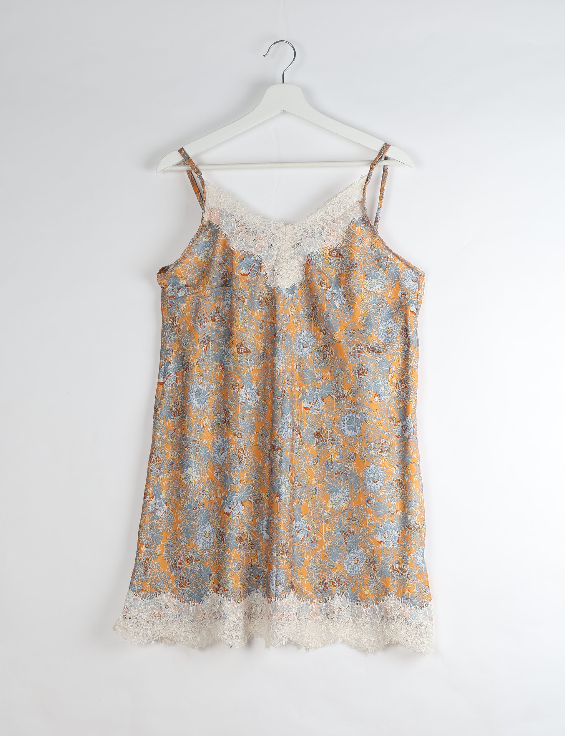Ärmelloses Unterkleid mit verstellbaren Spaghettiträgern, das knapp über dem Knie endet. Mit gewelltem Spitzeneinsatz am Ausschnitt und breitem Spitzenbesatz am Saum.