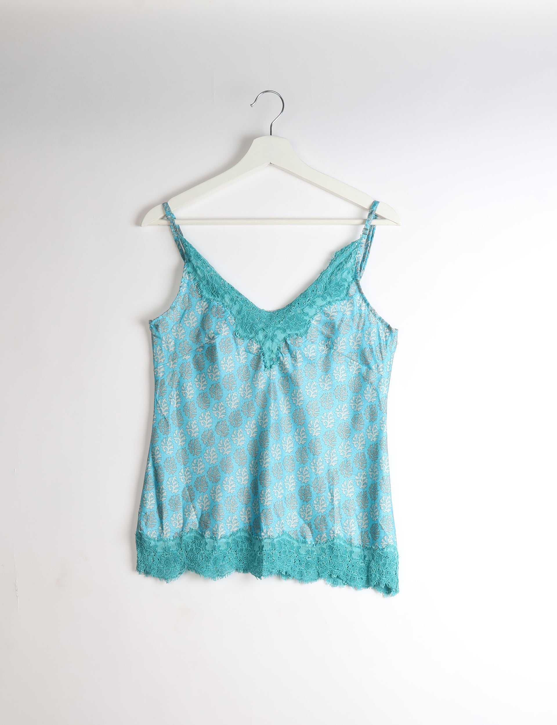 Zweiteiliges Nachtwäsche-Set bestehend aus einem Leibchen-Oberteil und einer gerade geschnittenen Hose. Das Camisole hat verstellbare Spaghettiträger und ist mit Spitzenbesatz an Ausschnitt und Saum versehen. Die Hose hat eine lockere Passform mit elastischem Bund.