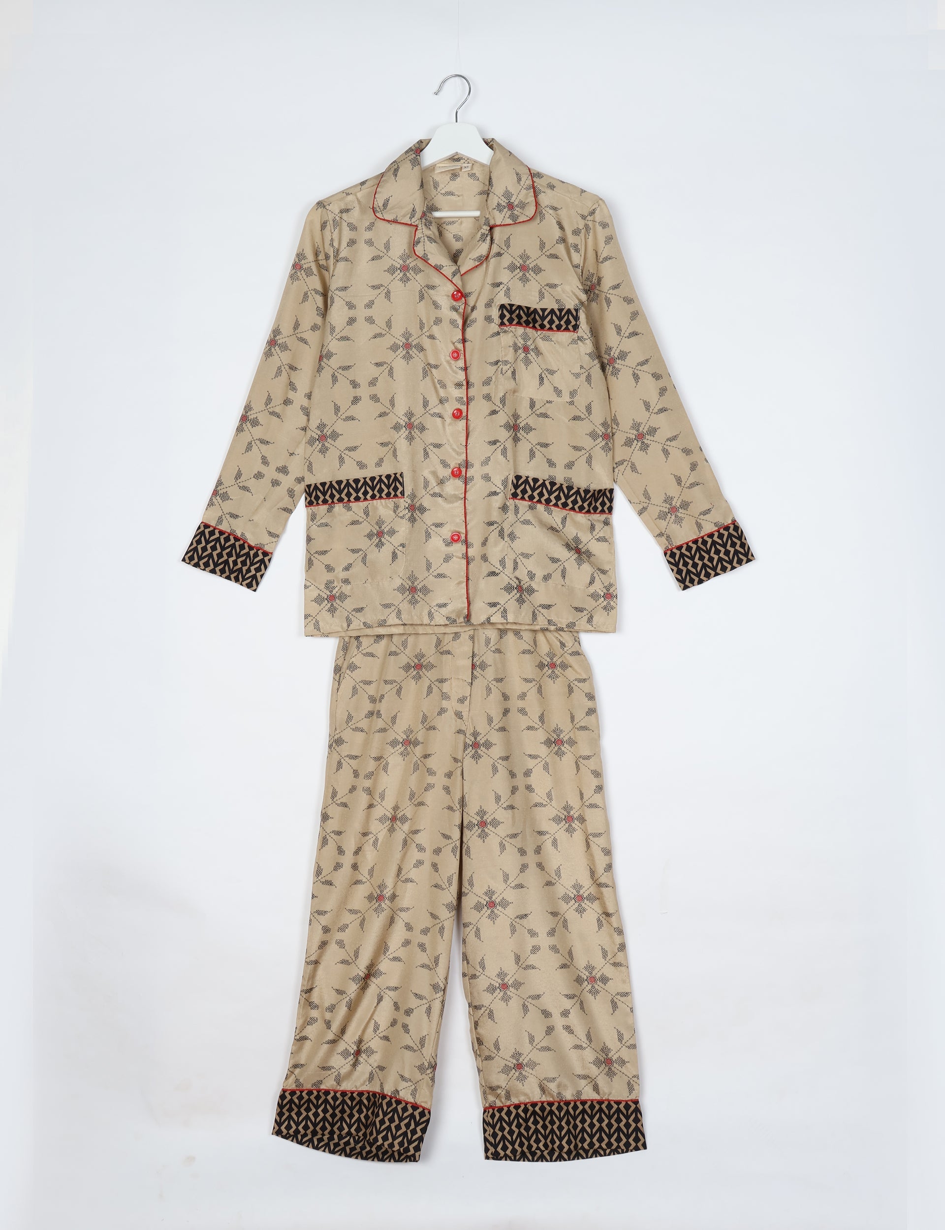 Zweiteiliges Pyjama-Set bestehend aus einem langärmeligen Button-Down-Hemd und einer lässigen Hose mit geradem Bein. Das Hemd hat ein fallendes Revers, Kontrastpaspeln, aufgesetzte Fronttaschen und eine Knopfleiste. Die Hose hat einen elastischen Bund mit Knopfverschluss. Sowohl Ober- als auch Unterteil sind mit bedruckten Kontrastsäumen versehen.
