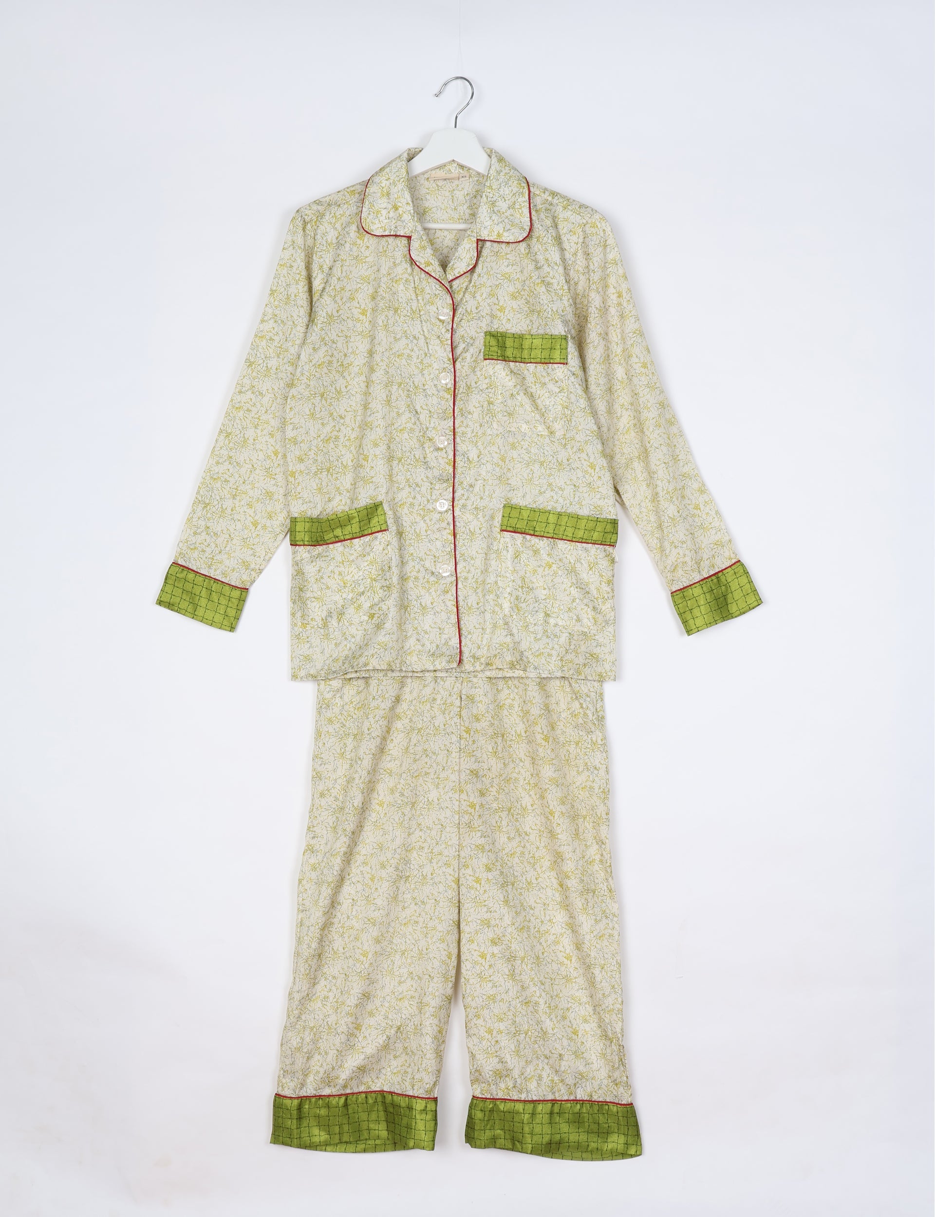 Zweiteiliges Pyjama-Set bestehend aus einem langärmeligen Button-Down-Hemd und einer lässigen Hose mit geradem Bein. Das Hemd hat ein fallendes Revers, Kontrastpaspeln, aufgesetzte Fronttaschen und eine Knopfleiste. Die Hose hat einen elastischen Bund mit Knopfverschluss. Sowohl Ober- als auch Unterteil sind mit bedruckten Kontrastsäumen versehen.