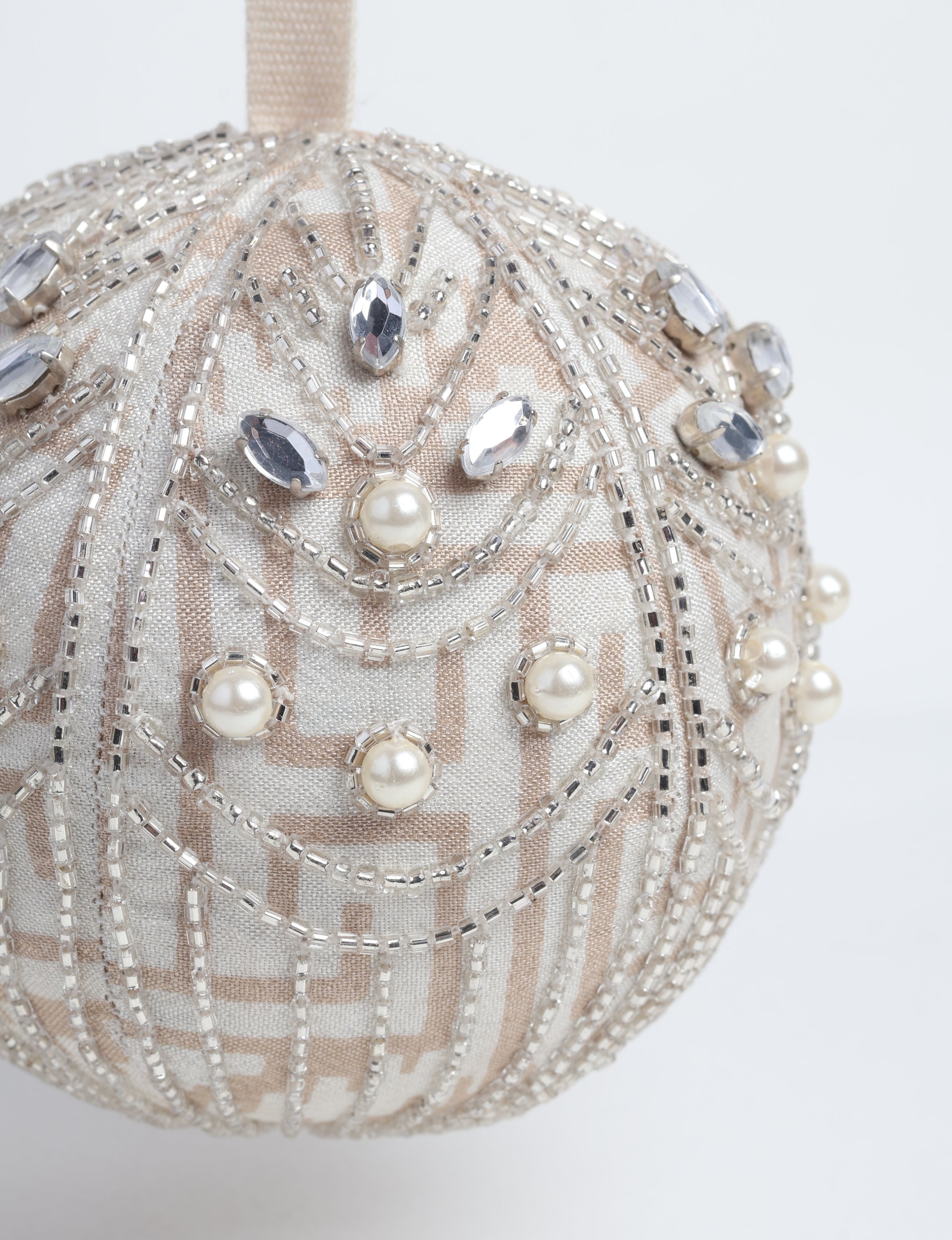 Discover the Silver Colored Precious Ball Ornament, crafted from ivory and grey upcycled saris. Filled with organic cotton and adorned with hand-embroidered silver embellishments, this eco friendly product reflects the beauty of sustainable fashion, ethical clothing, and circular fashion. Perfect for conscious homes embracing zero waste clothing and fair trade fashion.