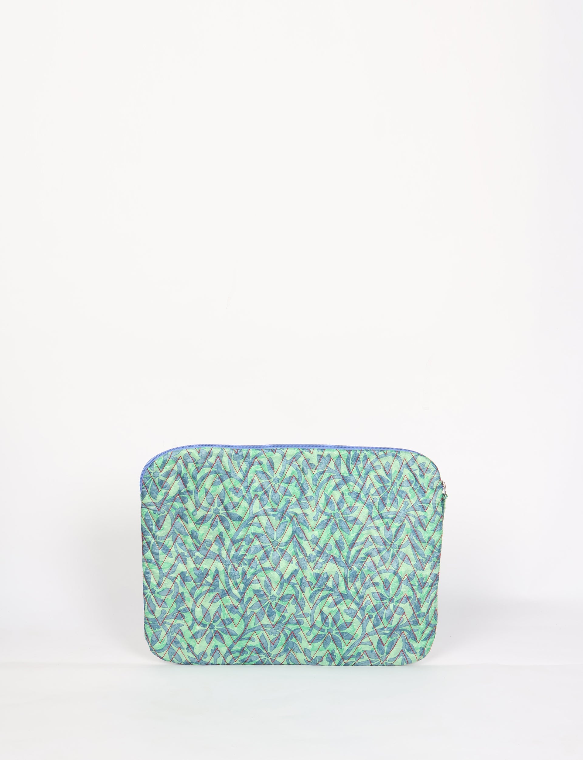 Eine gepolsterte Schutzhülle mit Sari-Panelen mit Chevron-Steppmuster, die auf 15–16 Zoll zugeschnitten ist und somit passend für Laptops und iPads. Das Schutzhülle hat ein kontrastierendes Innenfutter und Nylon. Zudem auch ein Spiralreißverschluss mit Metallschieber für sicheren Verschluss