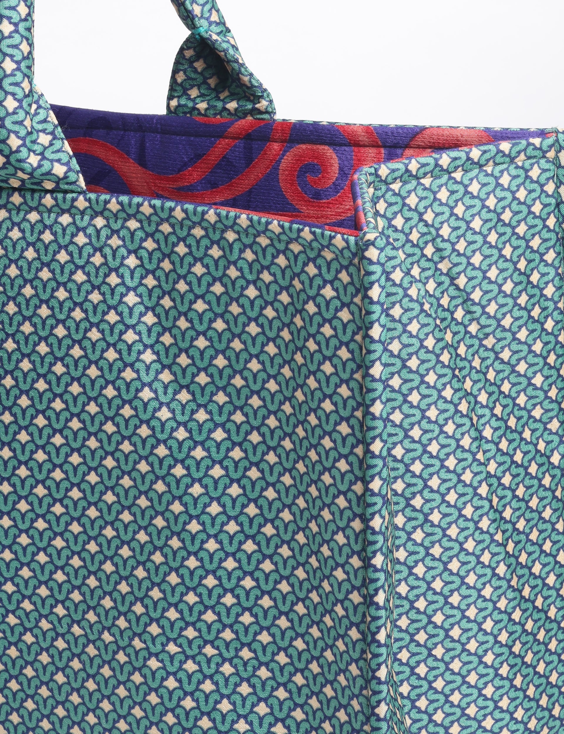 Halbstrukturierte Tragetasche, die dank verstärkter Bodenstruktur eine aufrechte Haltung ermöglicht. Die hat eine doppelte Tragefunktion dank weicher, gepolsterter Stoffgriffe, geeignet zum Tragen über der Schulter oder in der Hand. Gefüttert mit kontrastierendem Sari-Stoff.