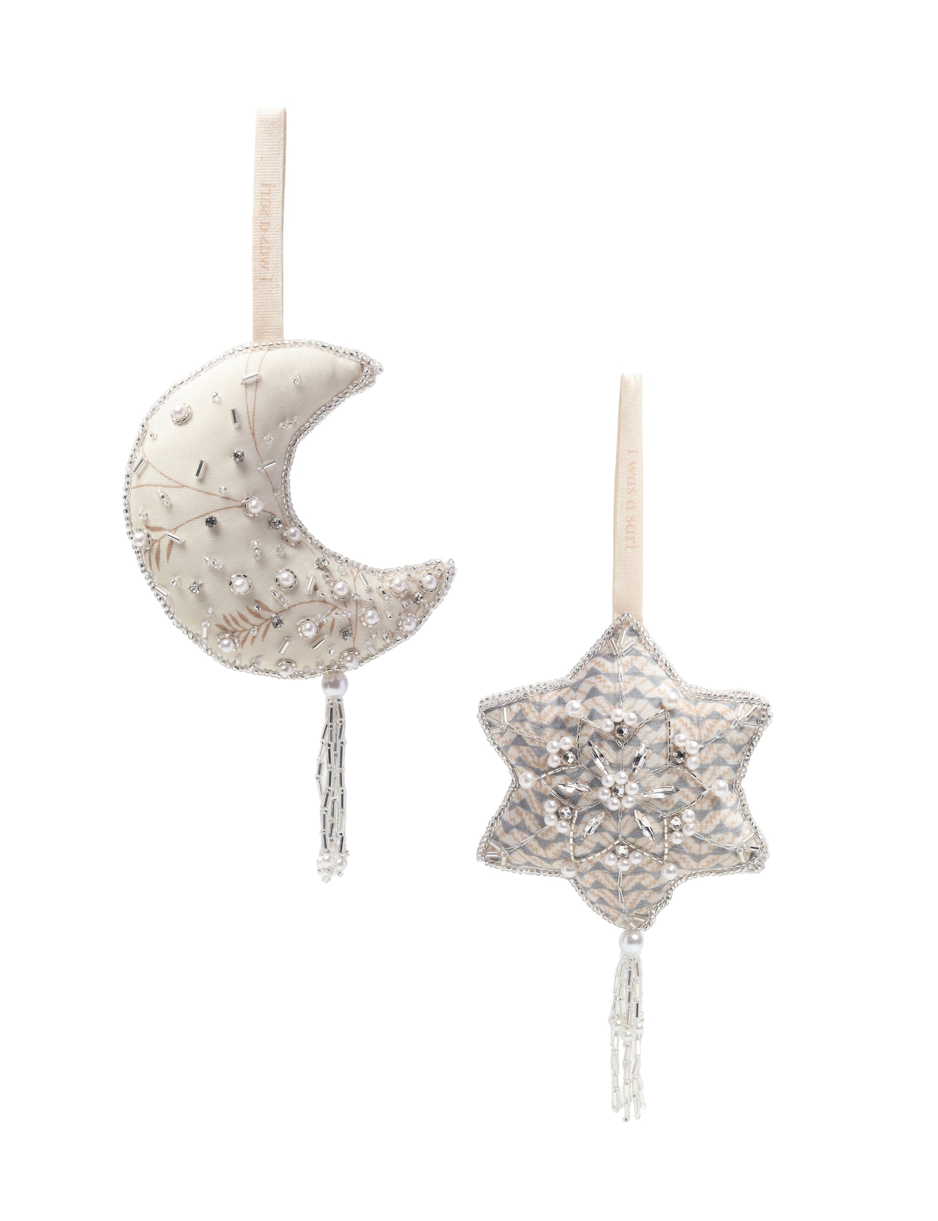 As assortment of three cheer ornaments - Heart, bell and star shaped. These festive decorations are made from a curation of vibrant colored saris and filled with leftover materials. Hand-embroidered with intricate Aari work with donated embrodered beads and stones. Lighting and screens may cause slight variations in color appearance.