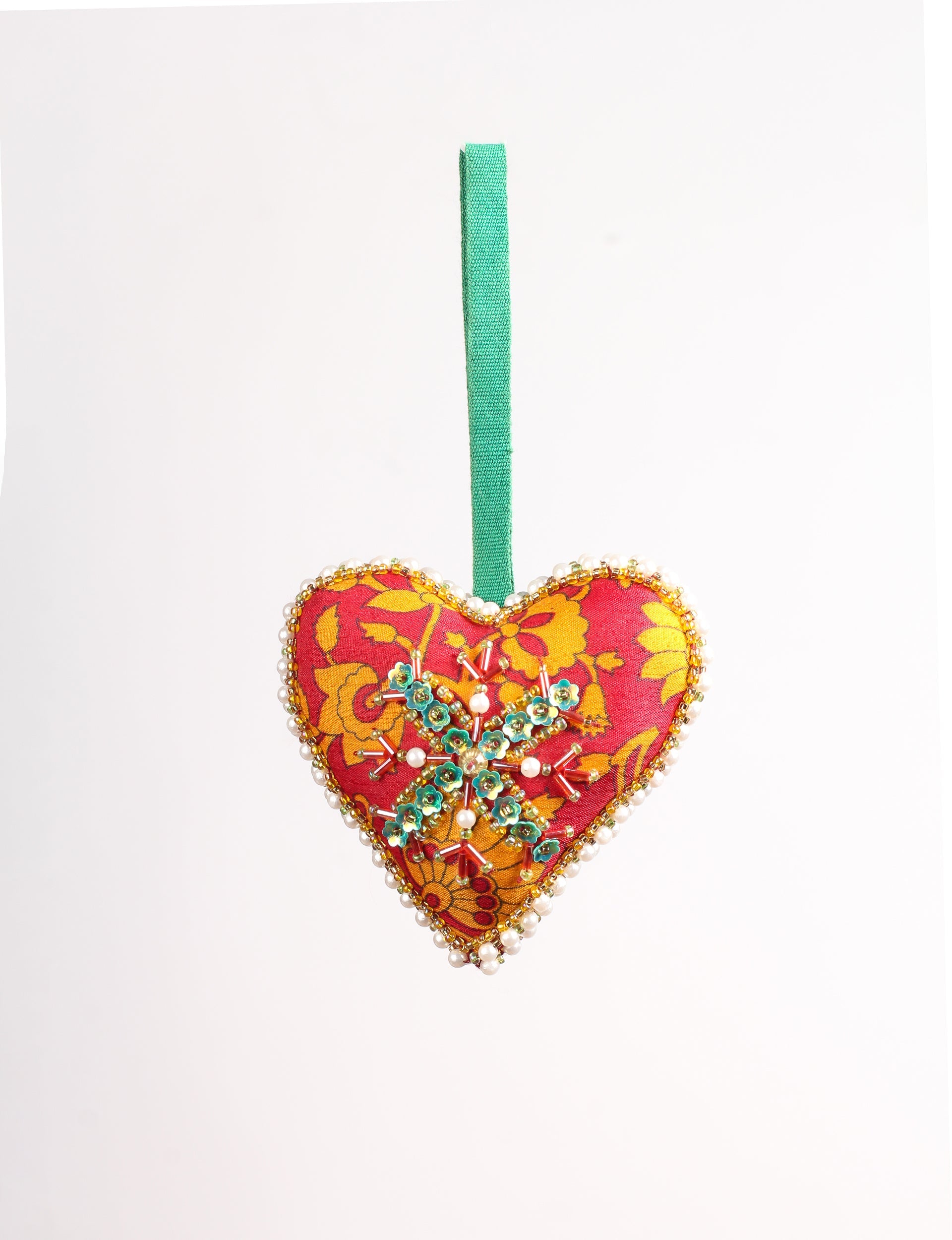 The heart-shaped festive decoration is made from a curation of vibrant colored saris and filled with leftover materials. Hand-embroidered with intricate Aari work with donated beads, sequins and pearls. Lighting and screens may cause slight variations in color appearance.