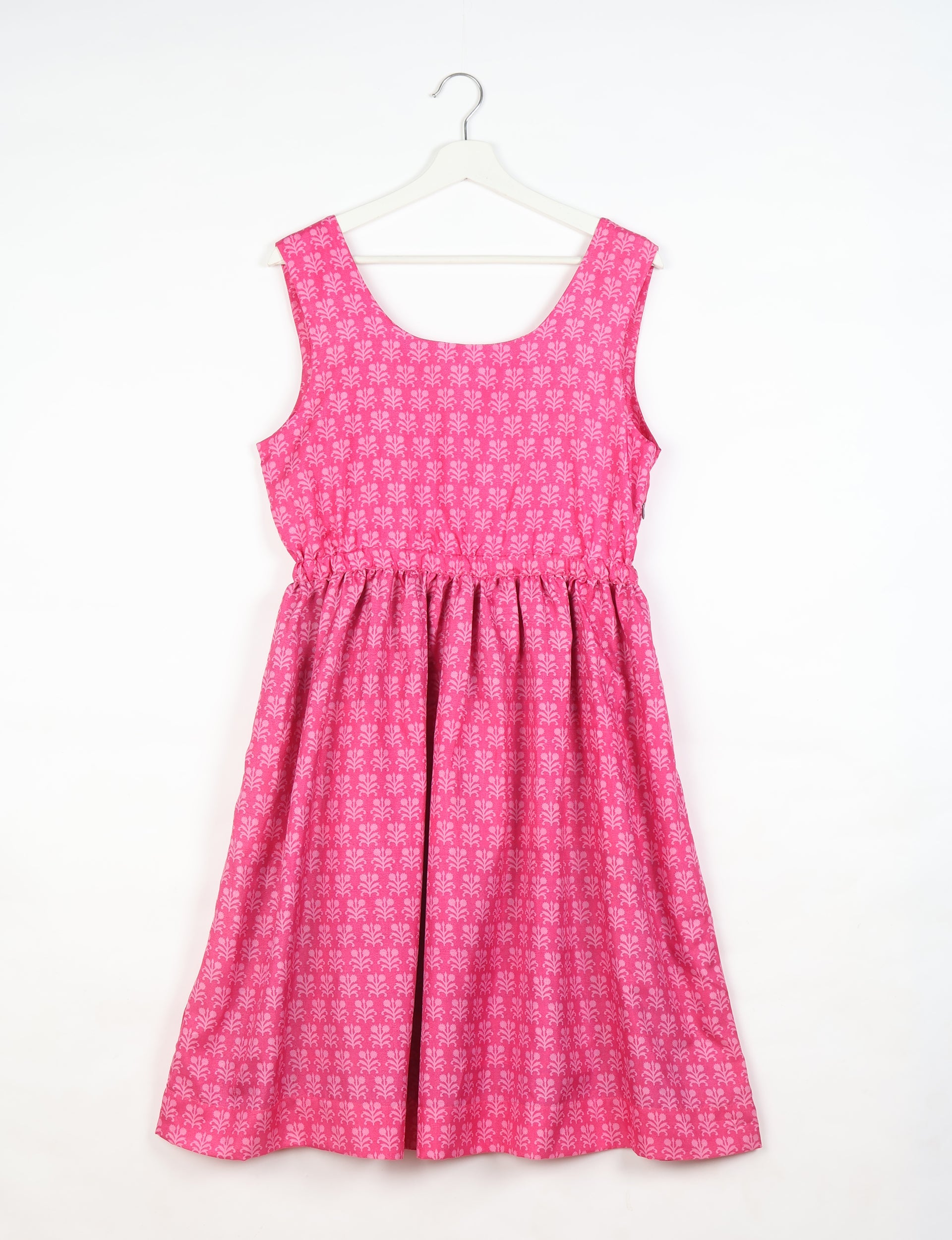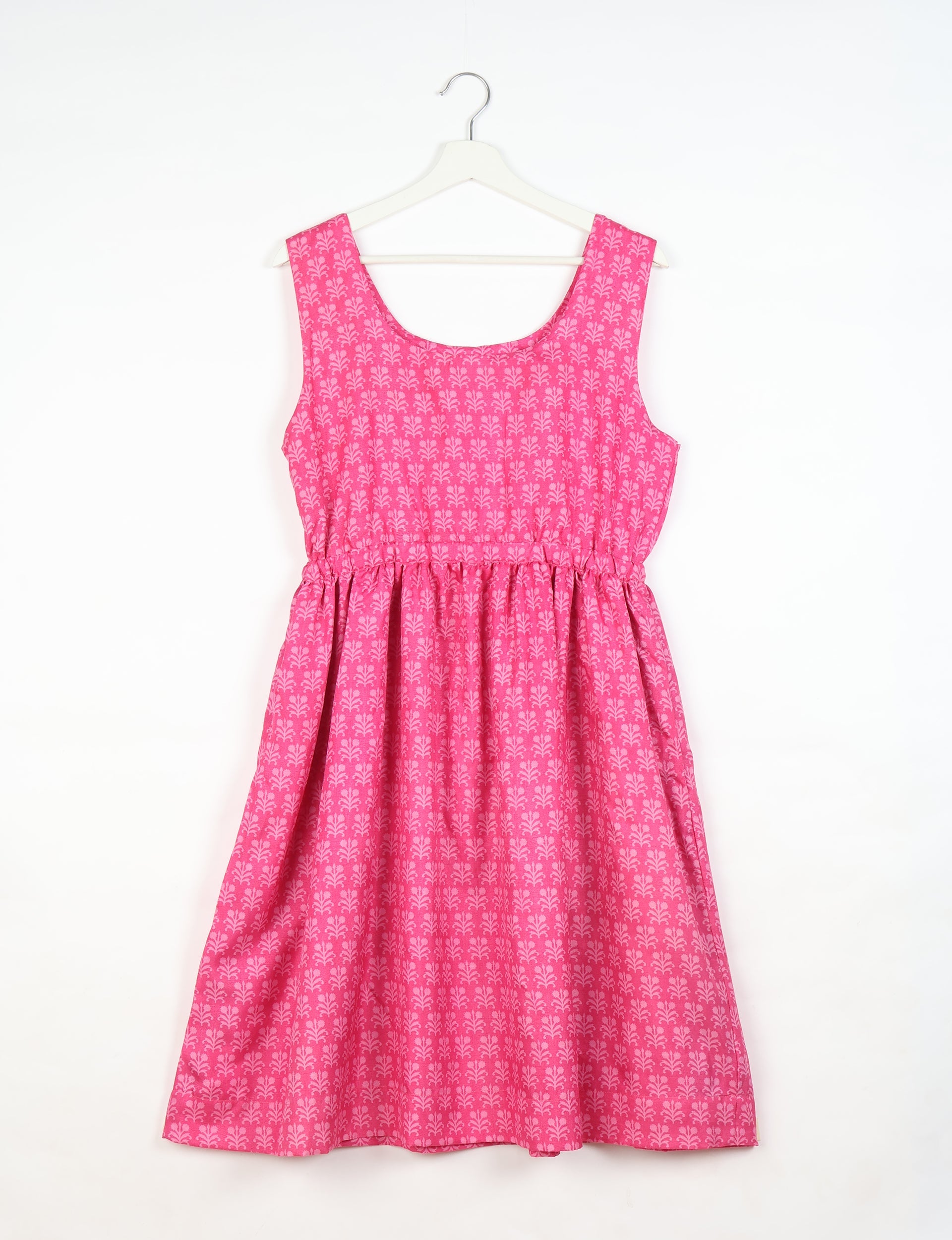 This is a sleeveless fit-and-flare dress featuring a scooped neckline and a defined waist seam. The waistline is cinched with elastic for comfort and flexibility, leading into a gathered flared skirt that finishes at knee length. Lighting and screens may cause slight variations in color appearance.