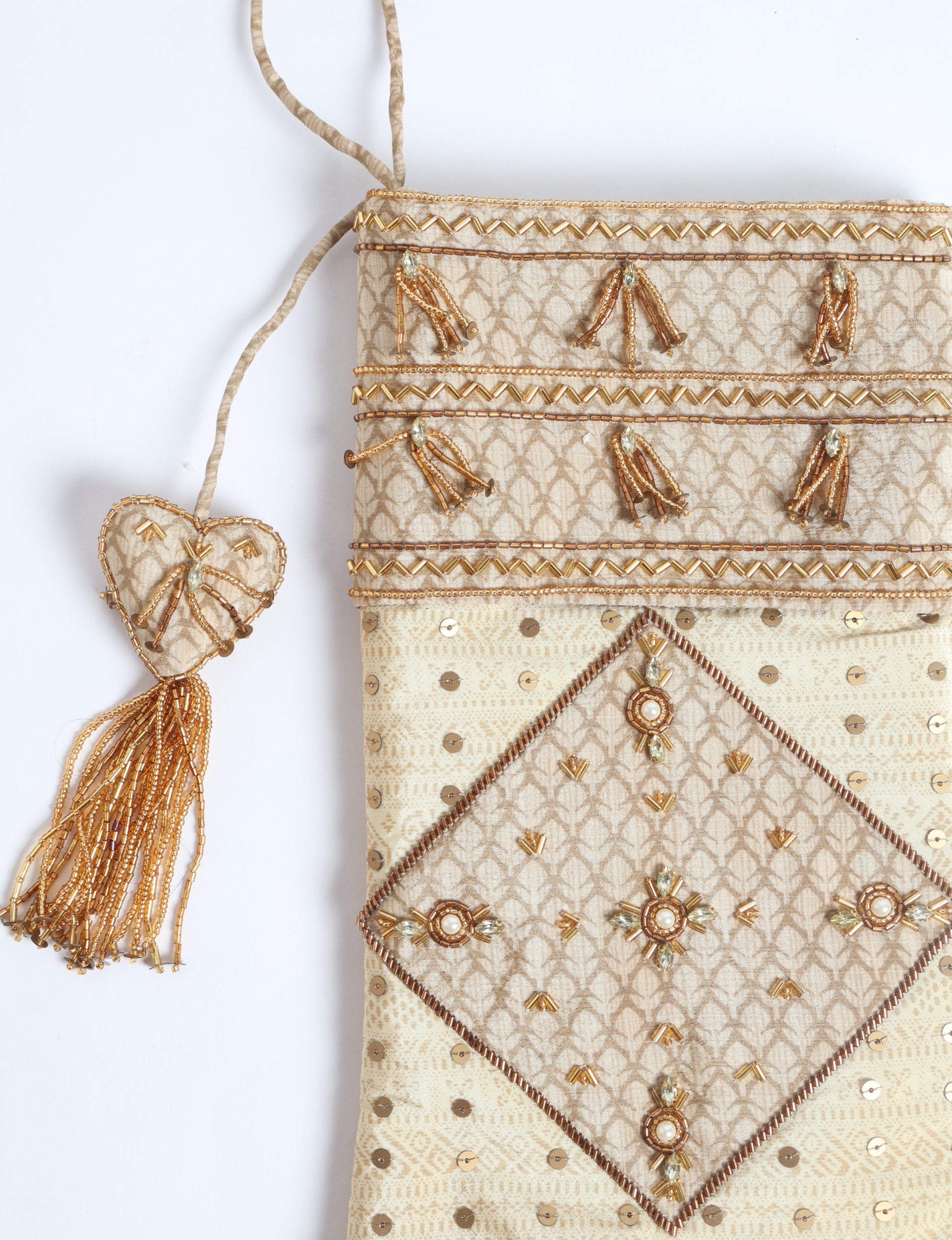 The Precious Christmas stocking is crafted from a curated palette of ivory and cream preloved saris with patchwork detailing, exquisite gold hand embroidered embellishments of stones, sequins, pearls and glass beads and a delicate heart charm ornament with beads tassel. Lighting and screens may cause slight variations in color appearance.
