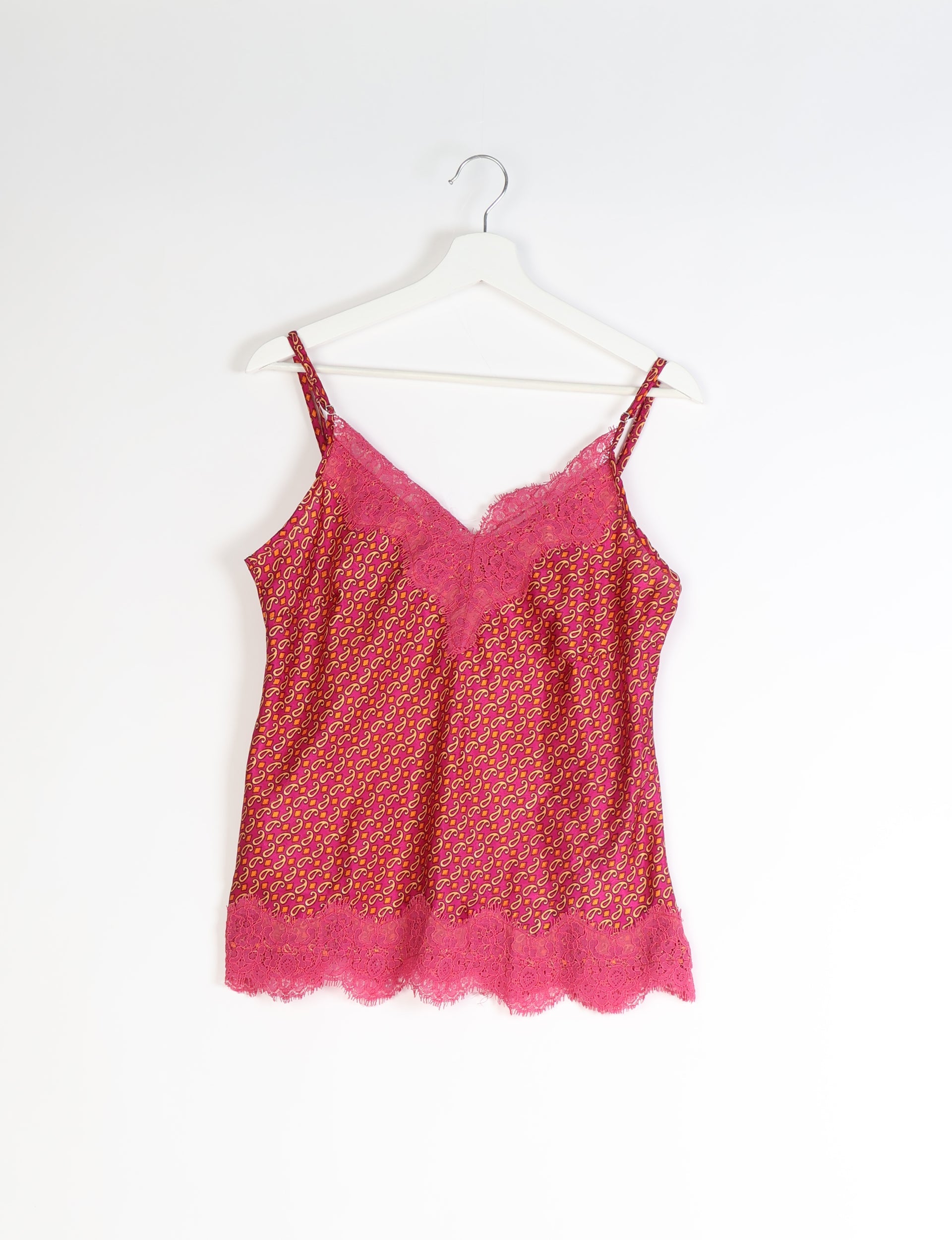 Two-piece sleepwear set consisting of a camisole top and straight-fit pants. The camisole features adjustable spaghetti straps and is finished with lace trim along the neckline and hem. The pants have a relaxed fit with an elasticated waist.