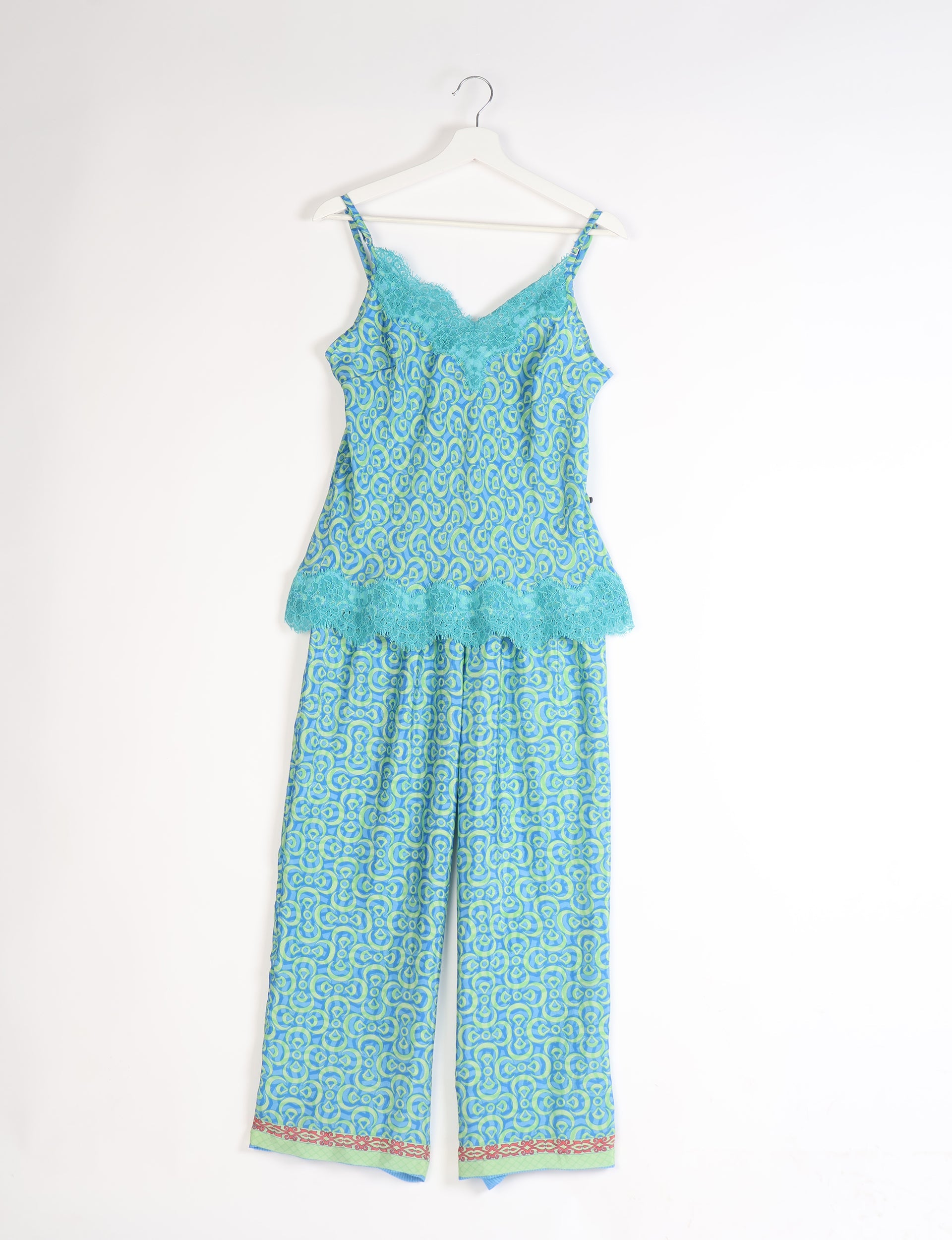 Two-piece sleepwear set consisting of a camisole top and straight-fit pants. The camisole features adjustable spaghetti straps and is finished with lace trim along the neckline and hem. The pants have a relaxed fit with an elasticated waist.