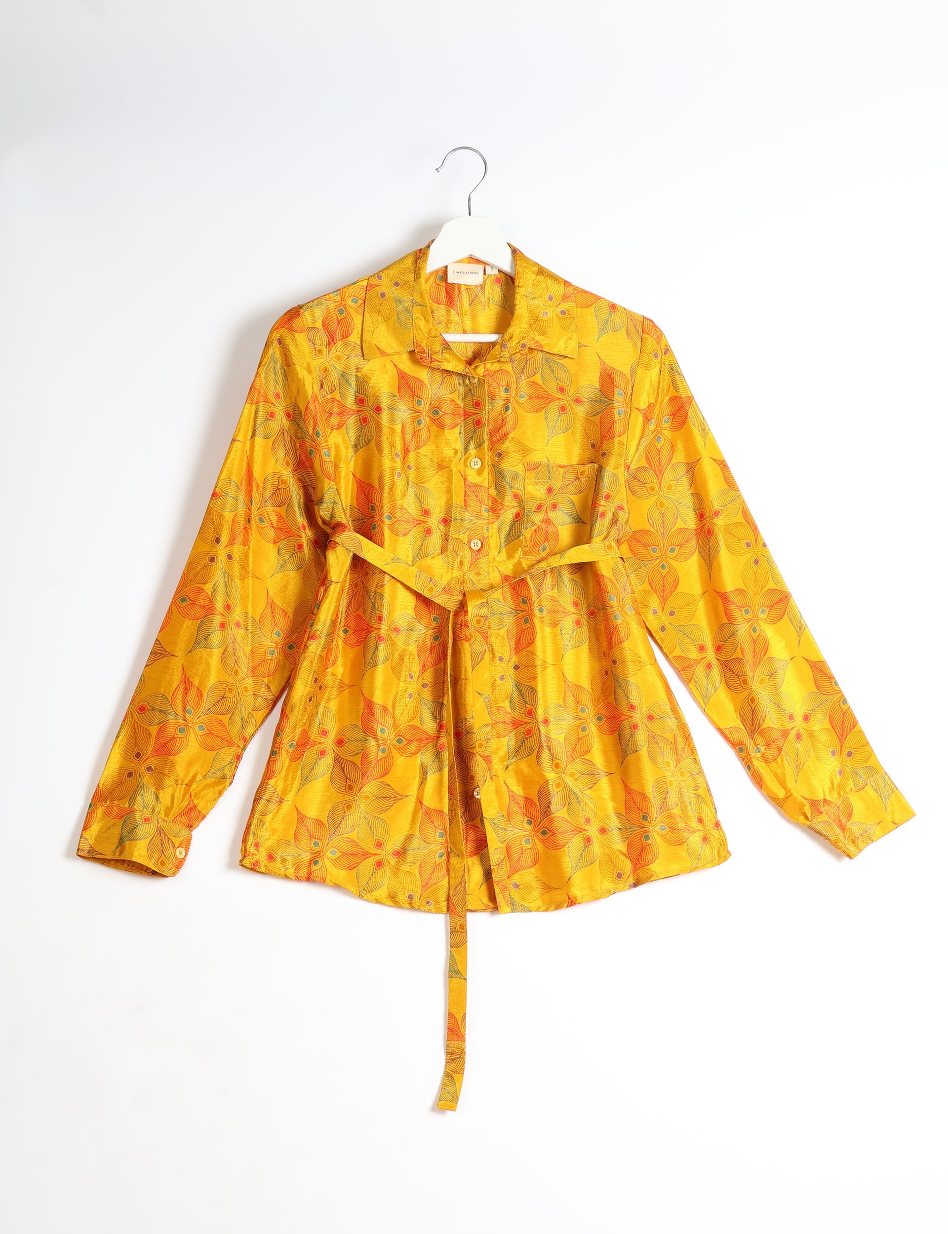 A slim-fit, long-sleeve shirt featuring a semi-spread collar and front button-down closure and a front pocket. It is constructed with standard shirt cuffs finished with button fastenings. The shirt includes a detachable self-fabric belt that can be styled at the waist or worn as a neck tie.