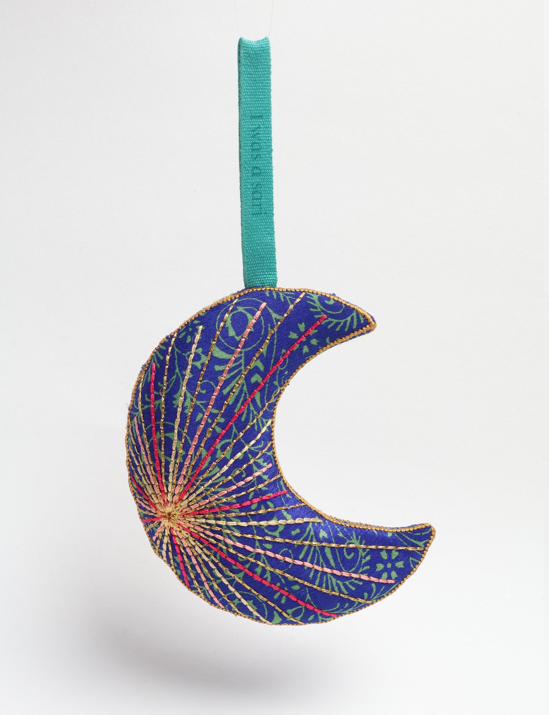 The crescent moon shaped decoration is made from preloved saris and filled with organic cotton filling. Embroidered with vibrant silk and metallic gold thread and hand finished. Lighting and screens may cause slight variations in color appearance.