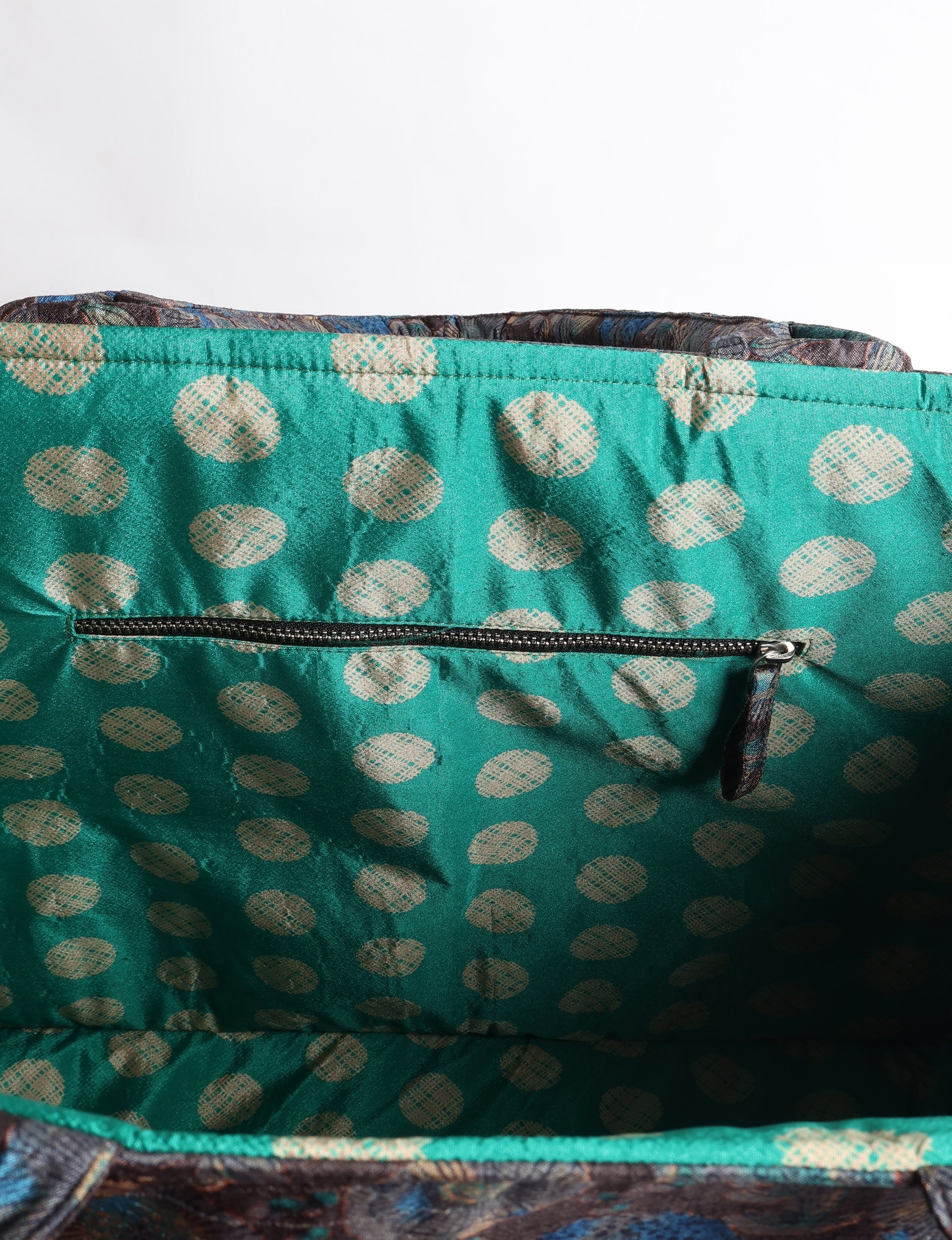 Semi-structured tote bag engineered to maintain upright posture due to reinforced base structure. Dual carry functionality via soft, padded fabric handles, suitable for shoulder or hand carry. Lined with contrast sari fabric. Internal compartment includes single zippered pocket for secure storage. Lighting and screens may cause slight variations in color appearance.