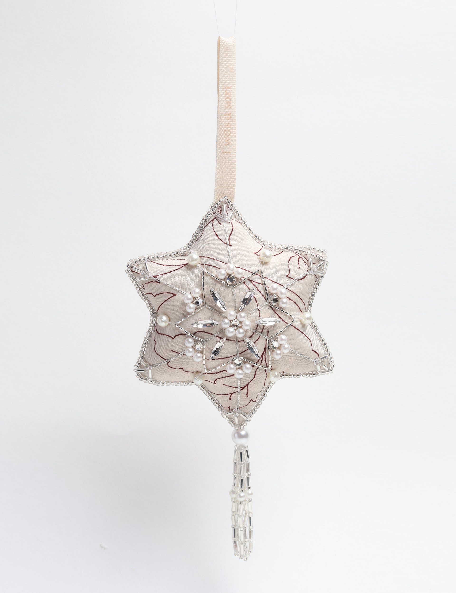 The Precious snowflake ornament silver is a carefully curated palette of ivory and grey preloved saris, filled with organic cotton and adorned with exquisite silver hand embroidered embellishments of stones, sequins, pearls and glass beads. Also has a tassel to further elevate the ornament. Lighting and screens may cause slight variations in color appearance.