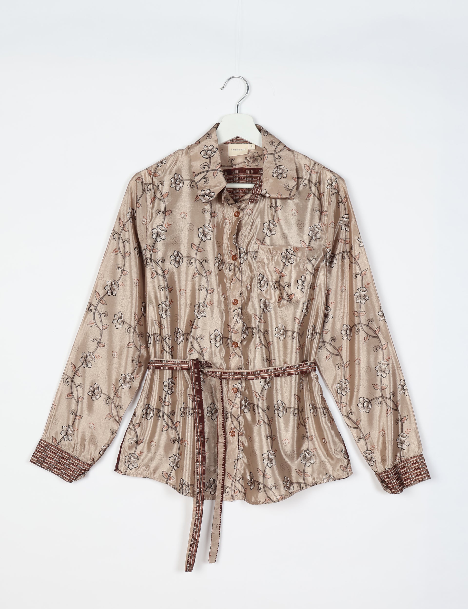 Camisa de manga larga y corte entallado con cuello semiabierto, cierre frontal con botones y bolsillo delantero. Confeccionada con puños estándar y botones. Incluye un cinturón desmontable del mismo tejido que se puede llevar a la cintura o como corbata. La iluminación y las pantallas pueden causar ligeras variaciones de color.