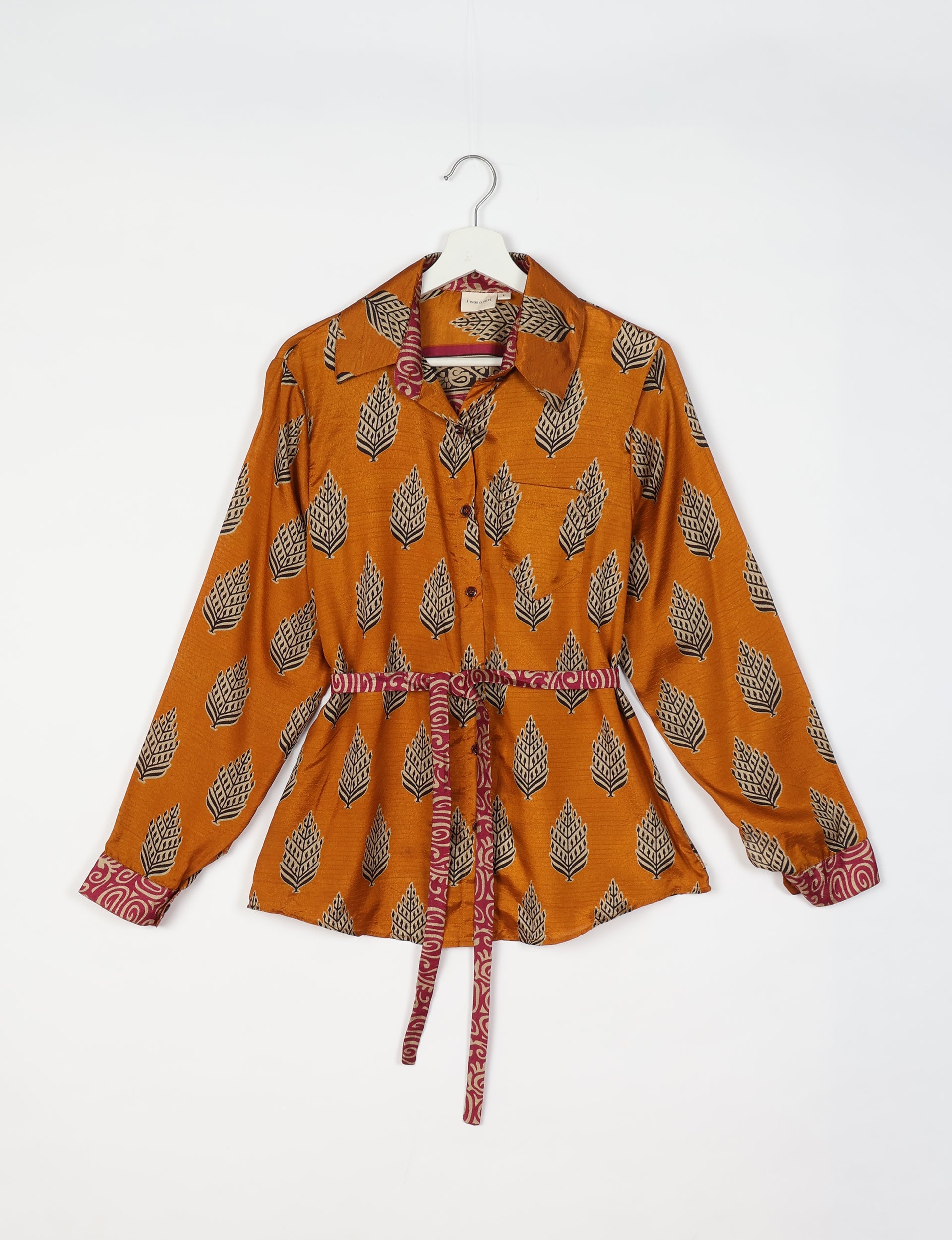 Camisa de manga larga y corte entallado con cuello semiabierto, cierre frontal con botones y bolsillo delantero. Confeccionada con puños estándar y botones. Incluye un cinturón desmontable del mismo tejido que se puede llevar a la cintura o como corbata. La iluminación y las pantallas pueden causar ligeras variaciones de color.