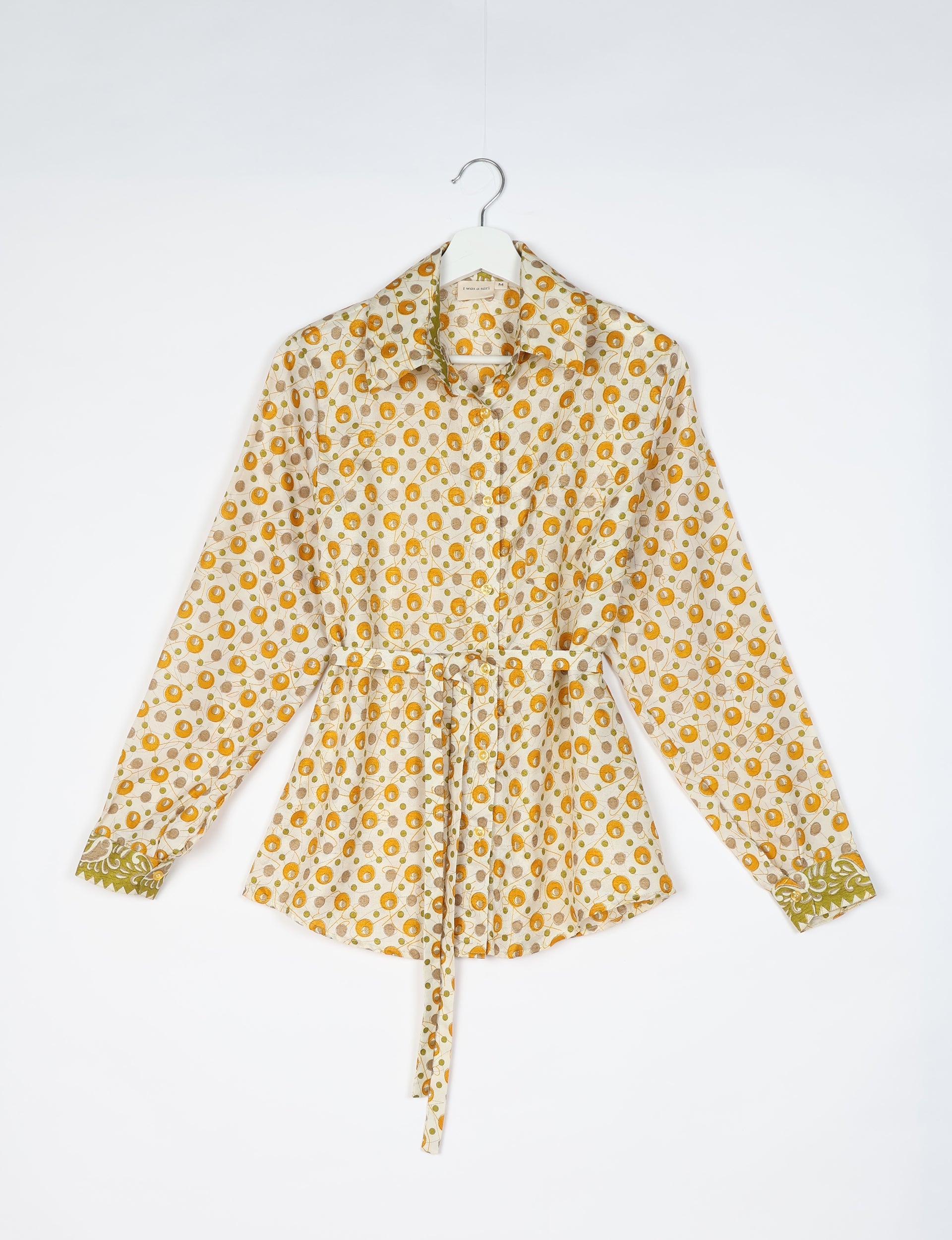 Camisa de manga larga y corte entallado con cuello semiabierto, cierre frontal con botones y bolsillo delantero. Confeccionada con puños estÔndar y botones. Incluye un cinturón desmontable del mismo tejido que se puede llevar a la cintura o como corbata. La iluminación y las pantallas pueden causar ligeras variaciones de color.