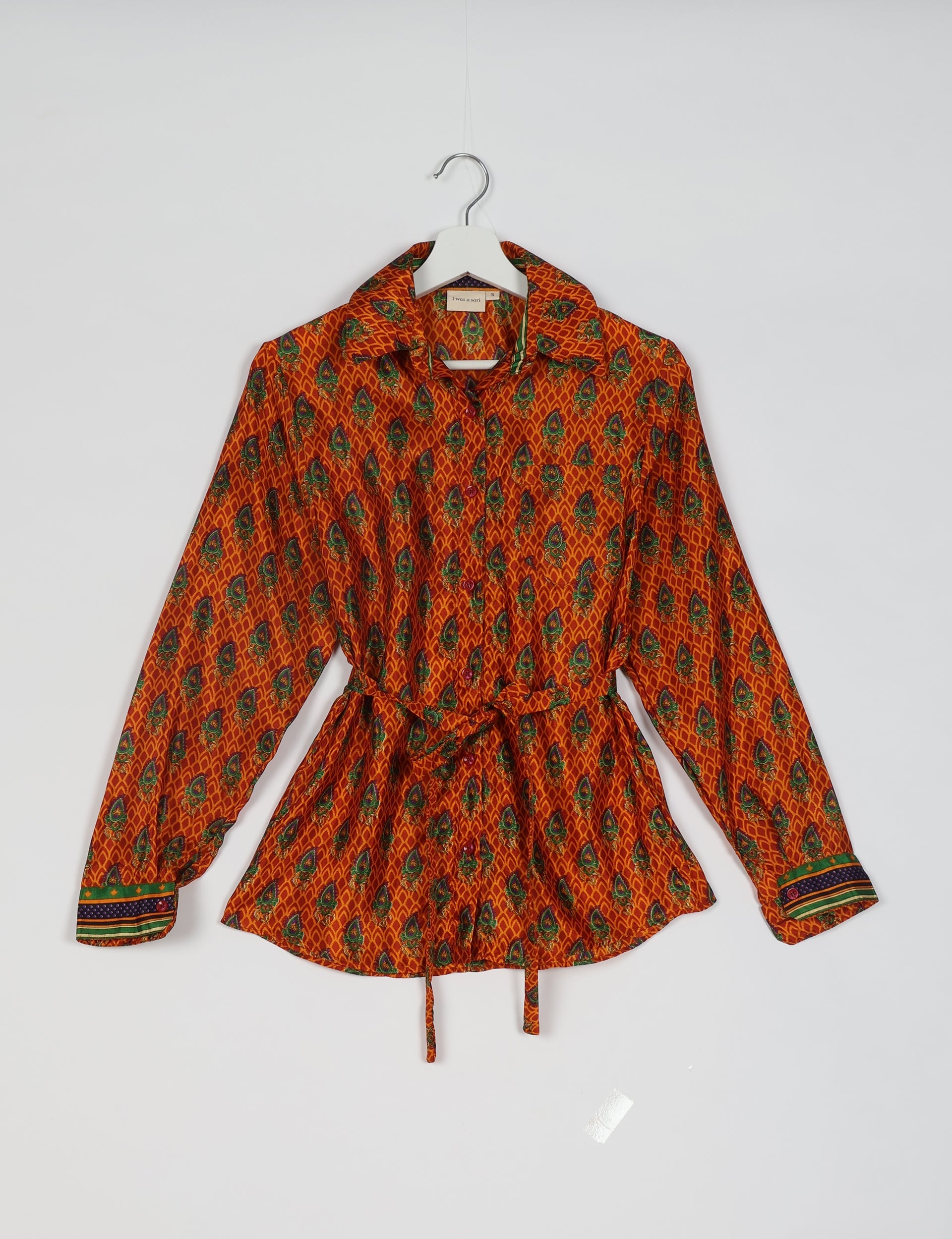 Camisa de manga larga y corte entallado con cuello semiabierto, cierre frontal con botones y bolsillo delantero. Confeccionada con puños estándar y botones. Incluye un cinturón desmontable del mismo tejido que se puede llevar a la cintura o como corbata. La iluminación y las pantallas pueden causar ligeras variaciones de color.