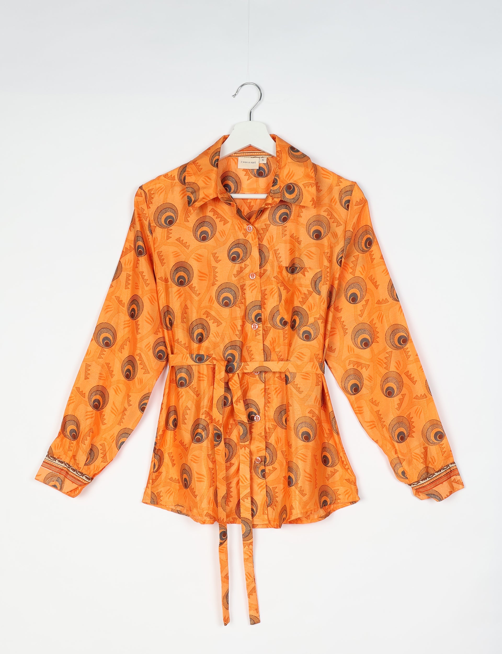 Camisa de manga larga y corte entallado con cuello semiabierto, cierre frontal con botones y bolsillo delantero. Confeccionada con puños estándar y botones. Incluye un cinturón desmontable del mismo tejido que se puede llevar a la cintura o como corbata. La iluminación y las pantallas pueden causar ligeras variaciones de color.