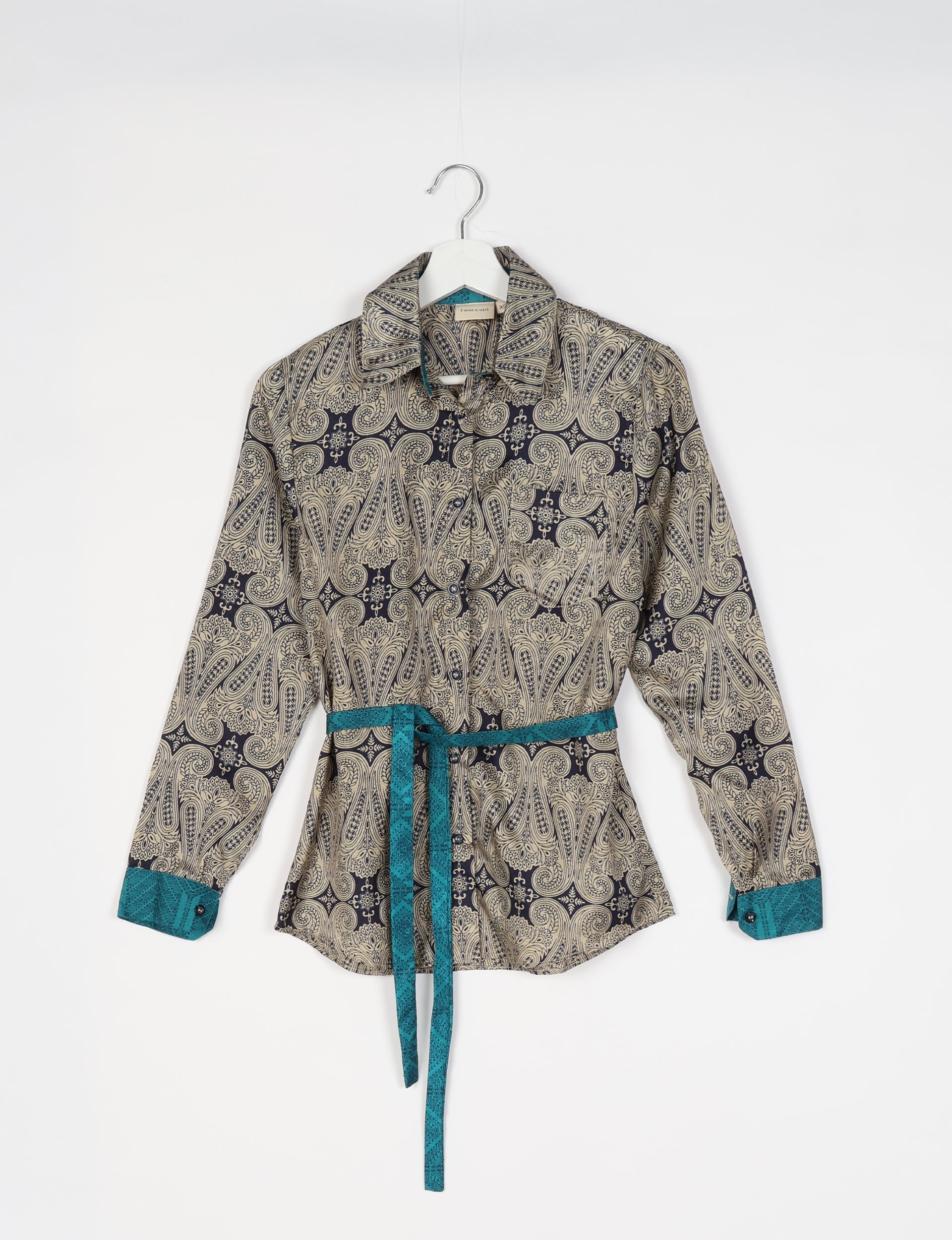 Camisa de manga larga y corte entallado con cuello semiabierto, cierre frontal con botones y bolsillo delantero. Confeccionada con puños estÔndar y botones. Incluye un cinturón desmontable del mismo tejido que se puede llevar a la cintura o como corbata. La iluminación y las pantallas pueden causar ligeras variaciones de color.