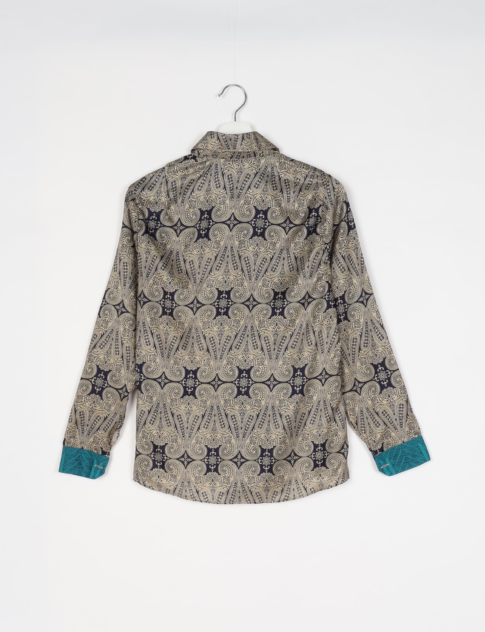A beautiful shirt, nice length so it can be worn tucked in or out. I like the back which is a different pattern and works really well.