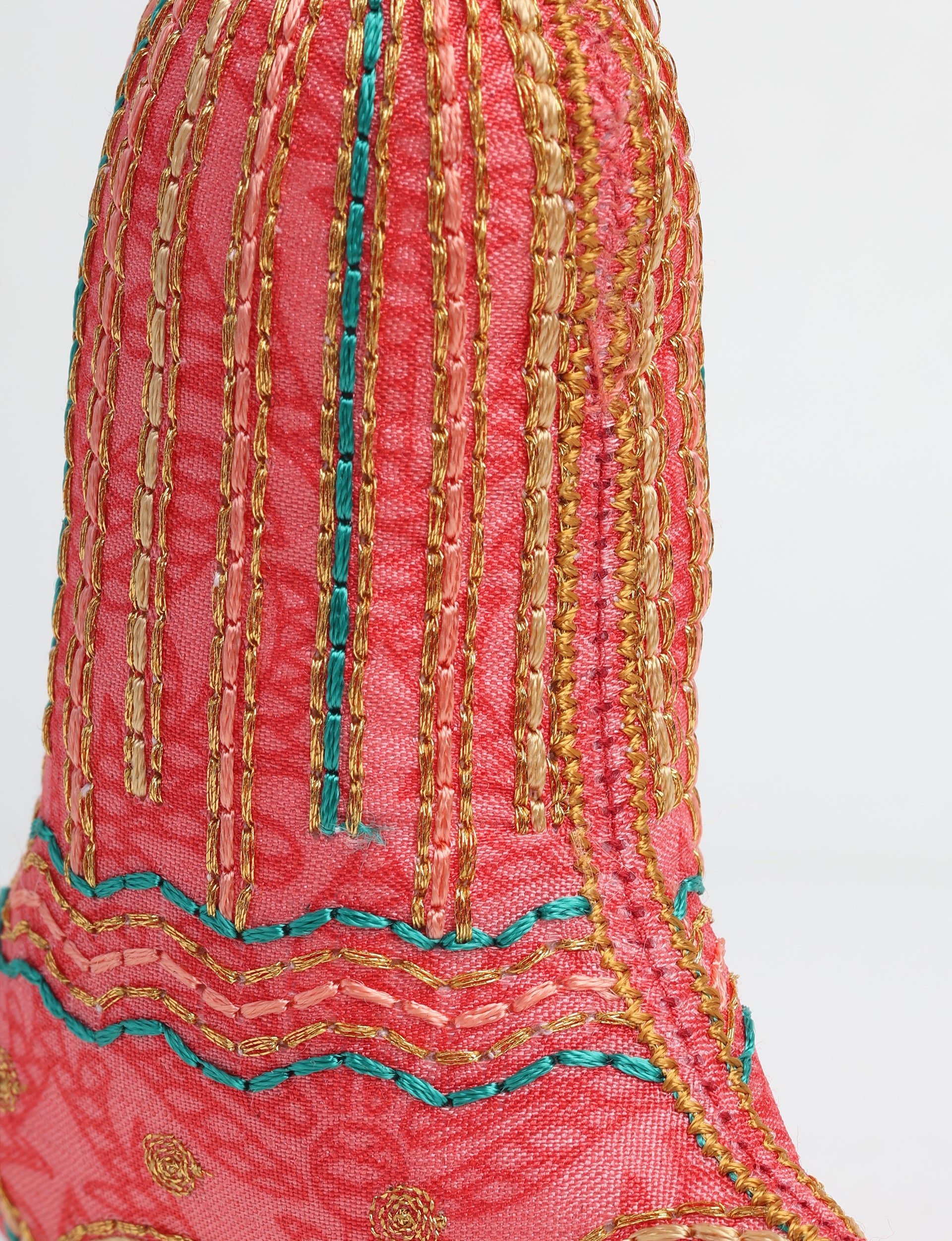 The bell-shaped festive decoration is made from preloved saris and filled with organic cotton filling. Embroidered with vibrant silk and metallic gold thread and hand finished. Lighting and screens may cause slight variations in color appearance.