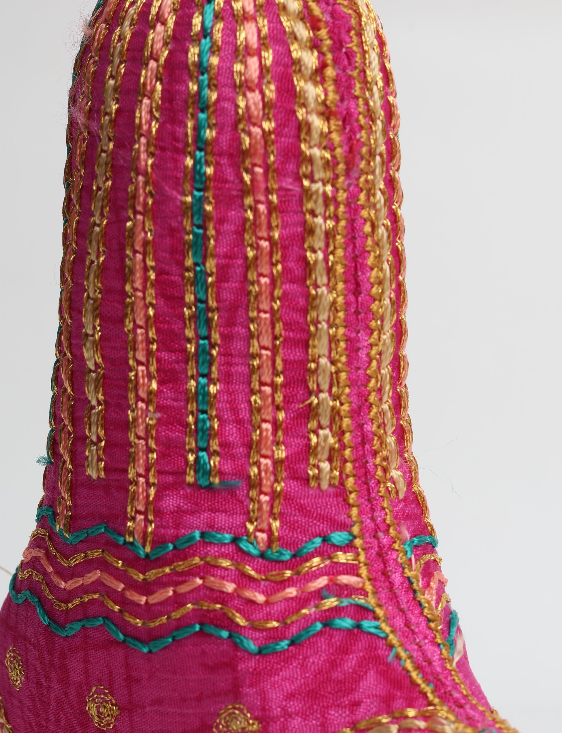 The bell-shaped festive decoration is made from preloved saris and filled with organic cotton filling. Embroidered with vibrant silk and metallic gold thread and hand finished. Lighting and screens may cause slight variations in color appearance.