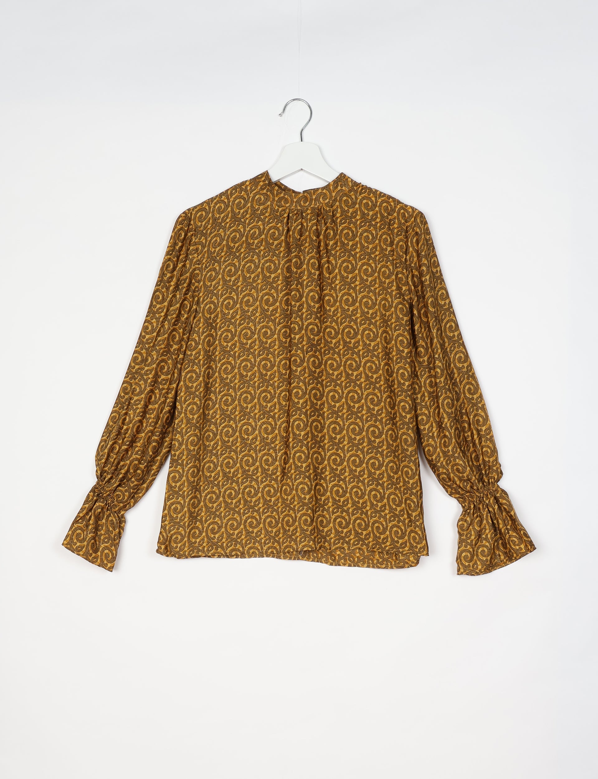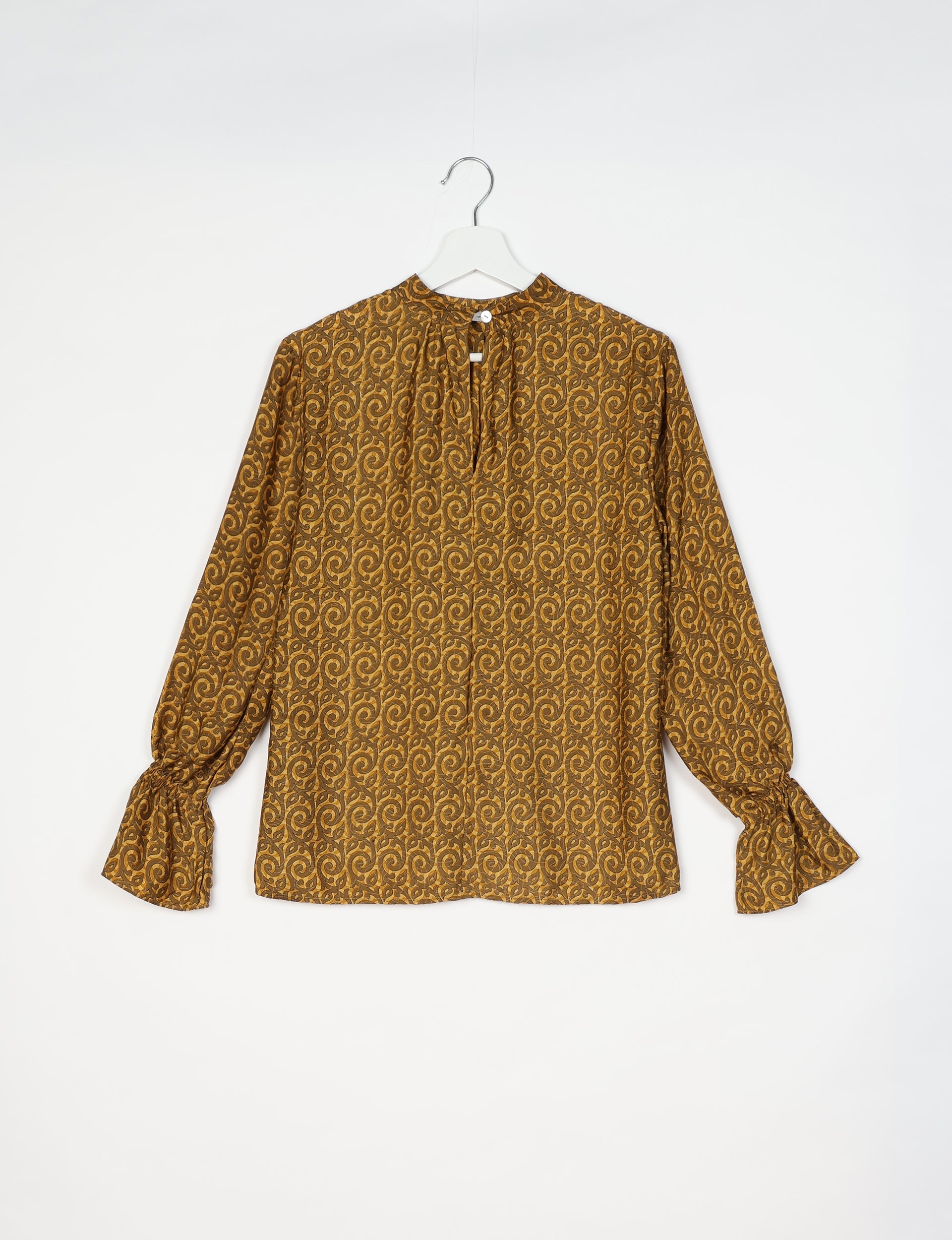 Esta blusa de manga larga presenta un escote fruncido con una abertura en la espalda, cerrada con un botón. Su silueta es relajada. Las mangas son largas, de corte campestre, y se fruncen en puños anchos con volante. La iluminación y las pantallas pueden causar ligeras variaciones en el color.