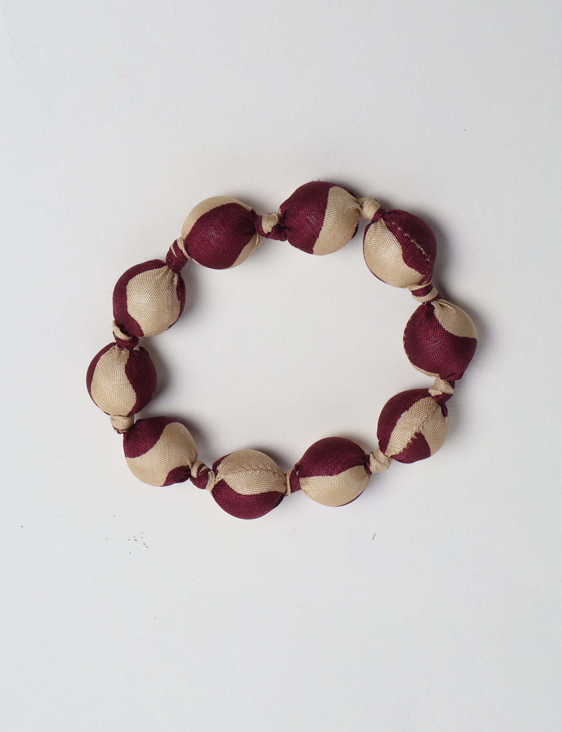 This piece did not pass our rigorous quality control due to a small tear in the fabric. This flaw is visible in certain lighting but does not affect the functionality. This piece is priced at a 40% discount to our original Beaded knotted bracelet. Our bracelets give pre-loved saris a second life by wrapping their brightly coloured and richly patterned fabrics around lightweight beads that fit comfortably around your wrist. Made by experienced craftswomen in Mumbai.