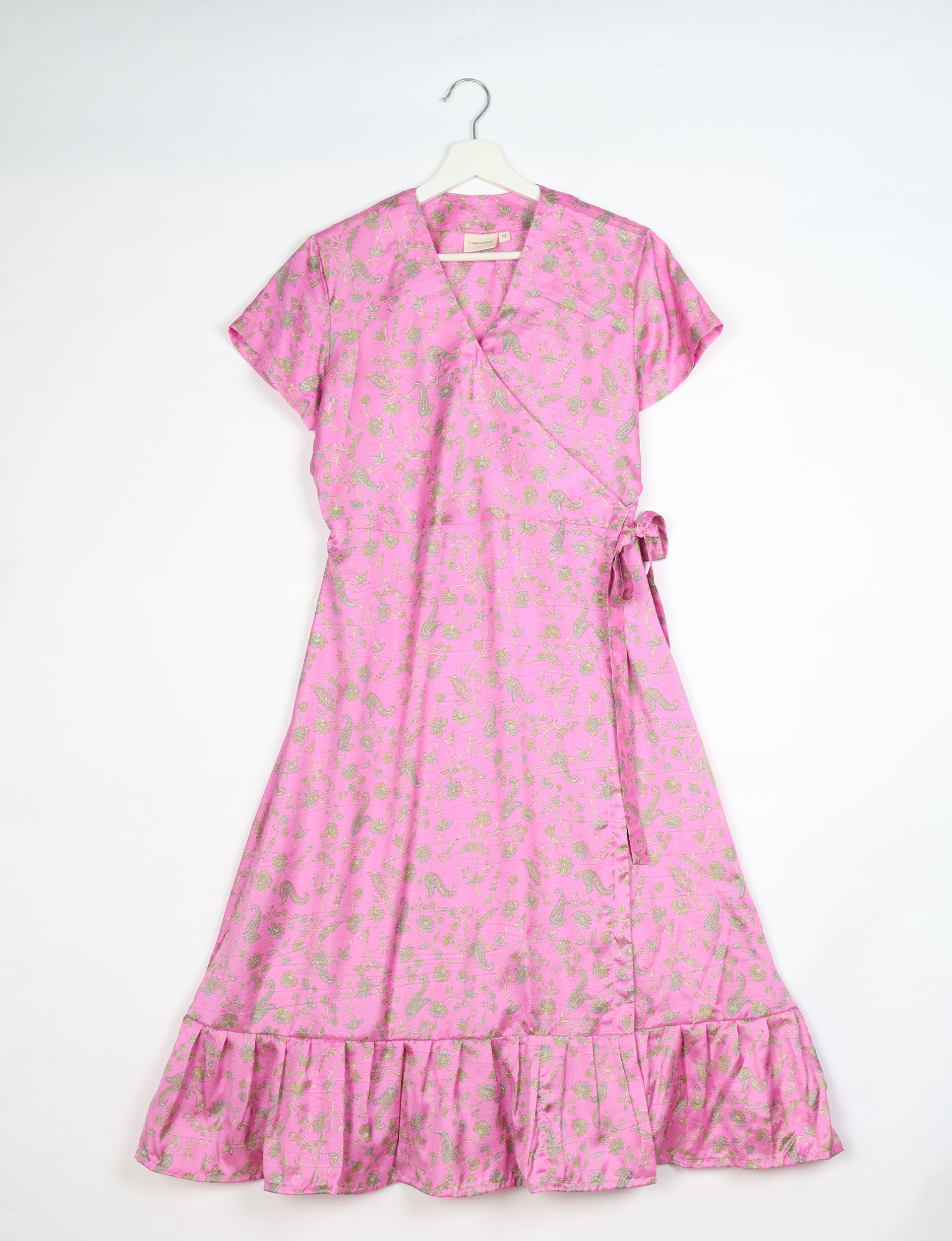 Este vestido cruzado de largo midi tiene mangas cortas. El corpiño tiene un diseño cruzado lateral que se ata con un cinturón del mismo tejido. La falda se ensancha hasta formar una línea A. El bajo está rematado con un volante fruncido que aporta volumen y movimiento. La iluminación y las pantallas pueden causar ligeras variaciones en el color.
