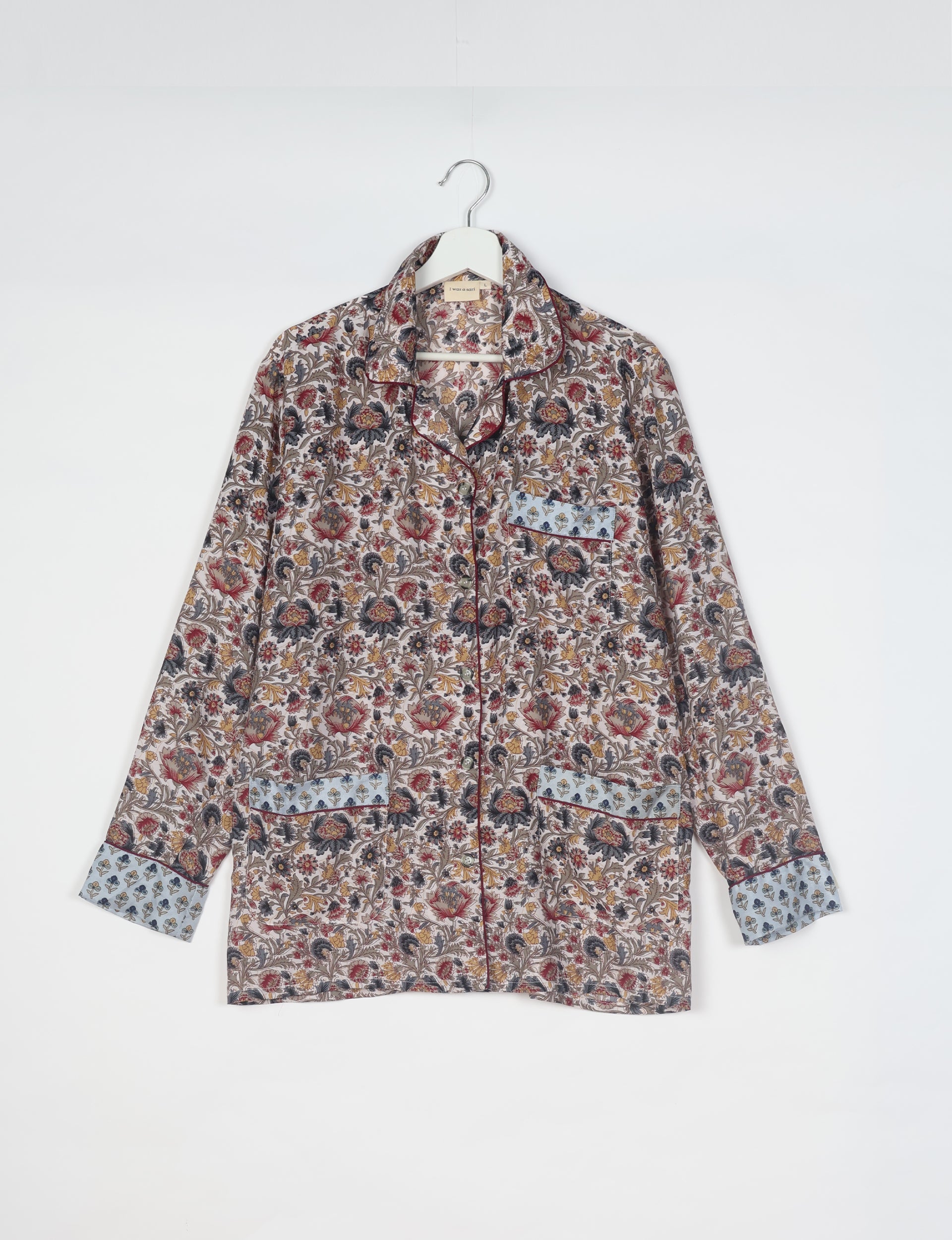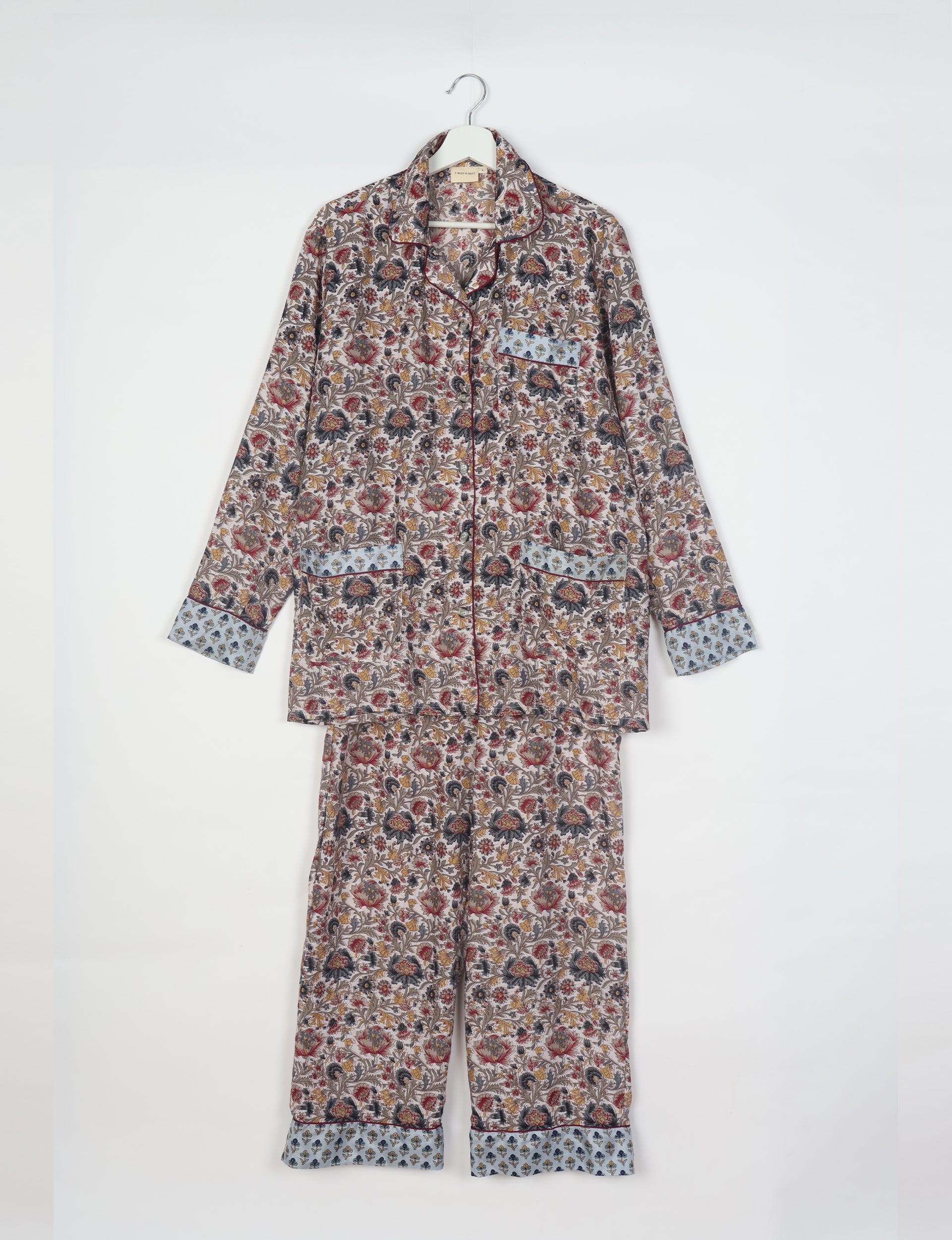 Conjunto de pijama de dos piezas coordinado compuesto por una camisa de manga larga con botones y un pantalón recto holgado. La camisa presenta solapas de muesca, ribetes en contraste, bolsillos de parche delanteros y tapeta con botones. El pantalón tiene cinturilla elástica con cierre de botones. Tanto la parte superior como la inferior presentan bajos estampados en contraste. La iluminación y las pantallas pueden causar ligeras variaciones de color.