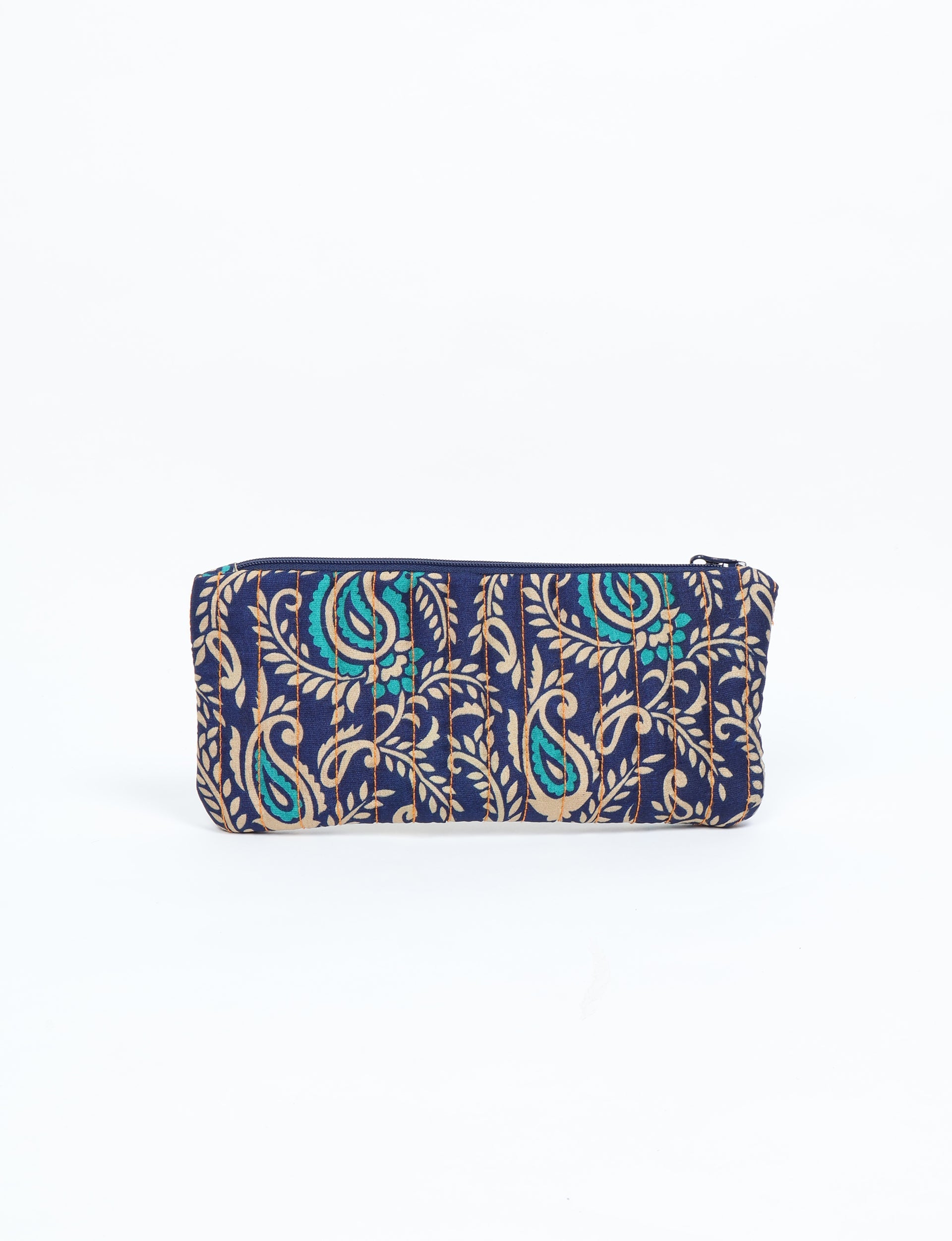 The quilted pencil pouch features a padded fabric body with stitched detailing and a top zip closure, suitable for carrying pens, pencils, and small essentials. Lighting and screens may cause slight variations in color appearance.