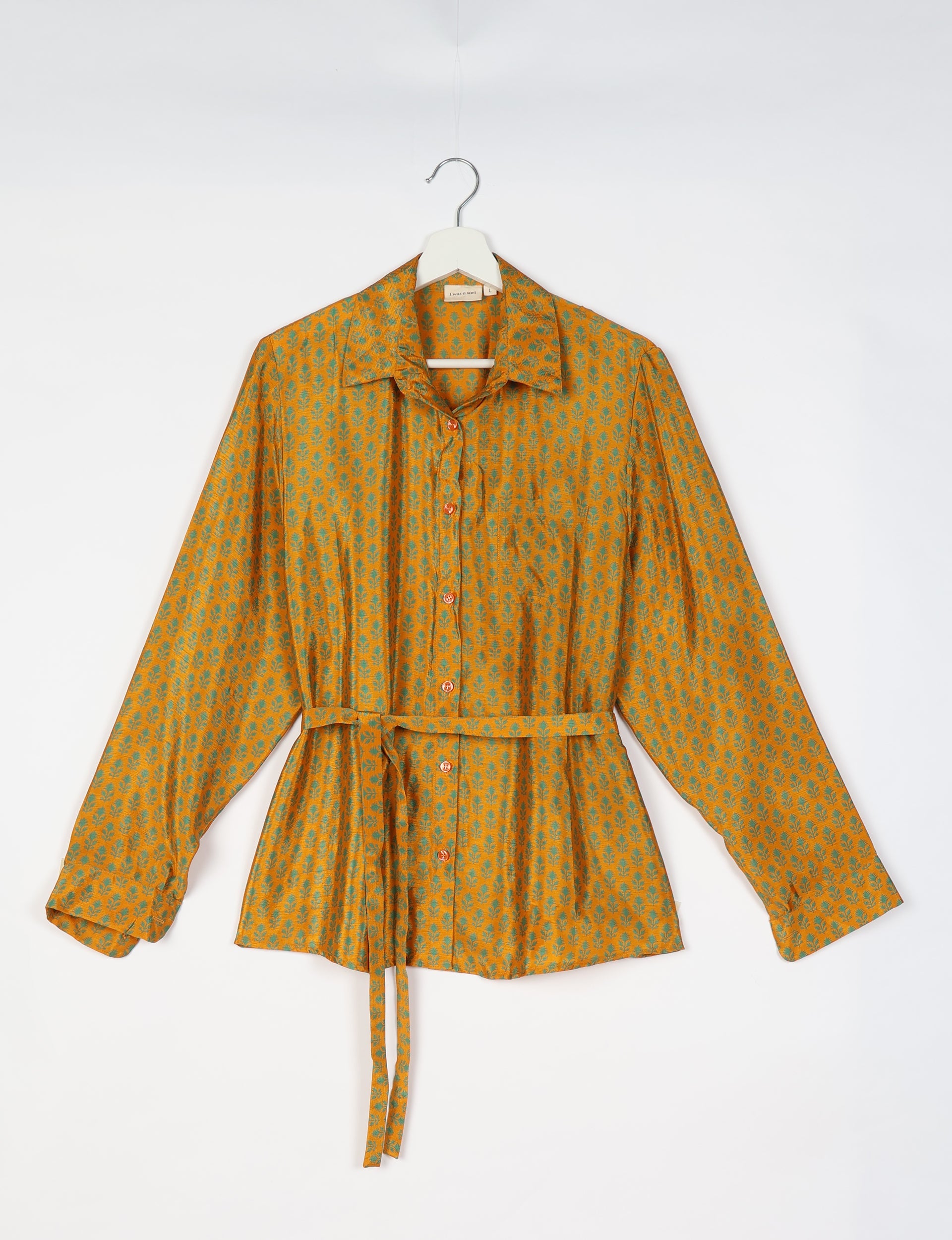 Camisa de manga larga y corte entallado con cuello semiabierto, cierre frontal con botones y bolsillo delantero. Confeccionada con puños estÔndar y botones. Incluye un cinturón desmontable del mismo tejido que se puede llevar a la cintura o como corbata. La iluminación y las pantallas pueden causar ligeras variaciones de color.