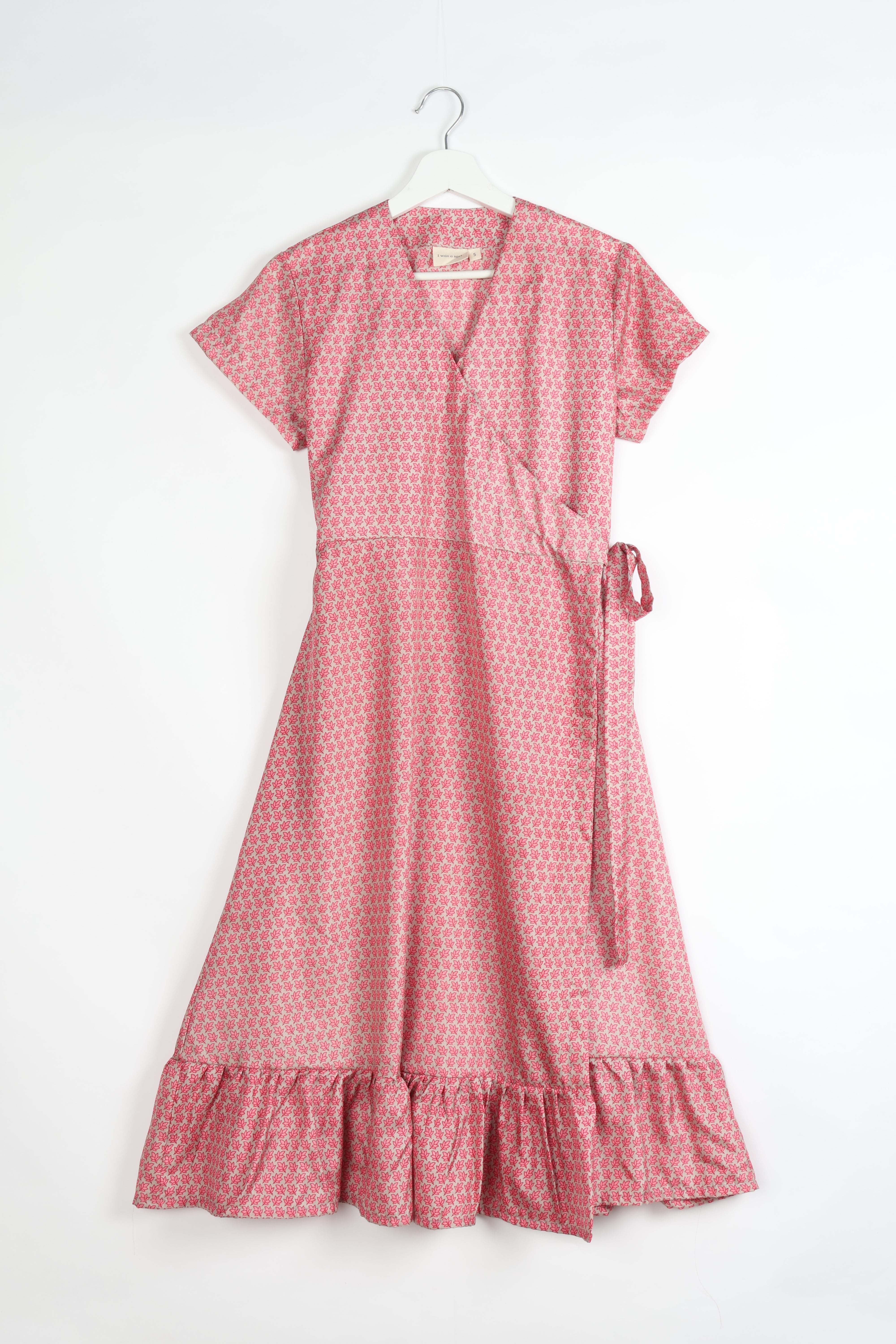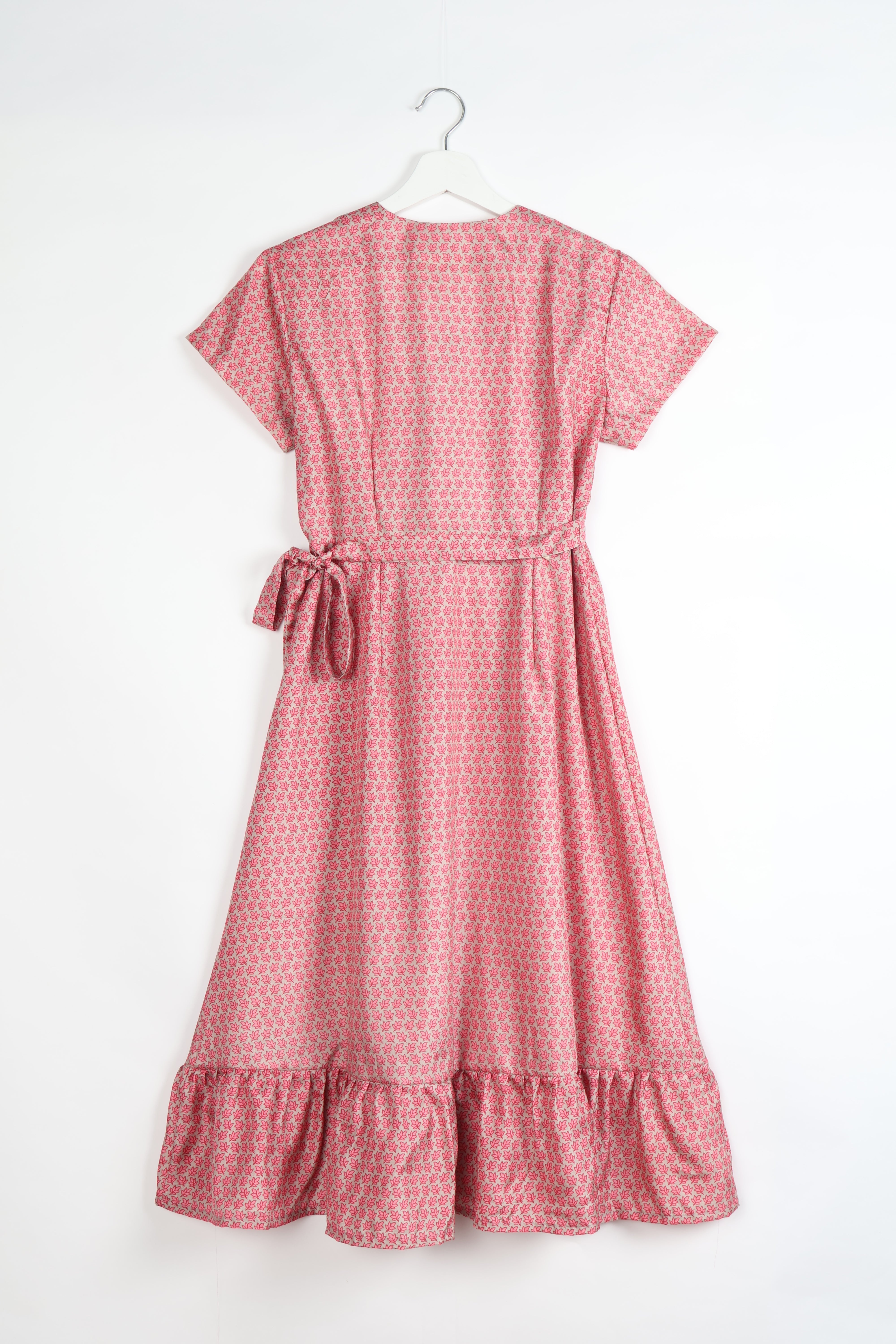 Este vestido cruzado de largo midi tiene mangas cortas. El corpiño tiene un diseño cruzado lateral que se ata con un cinturón del mismo tejido. La falda se ensancha hasta formar una línea A. El bajo está rematado con un volante fruncido que aporta volumen y movimiento. La iluminación y las pantallas pueden causar ligeras variaciones en el color.